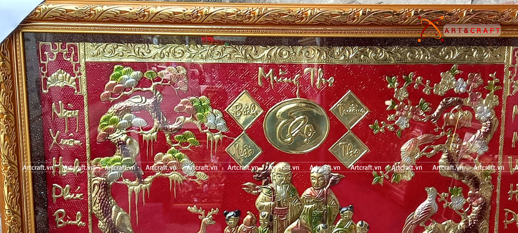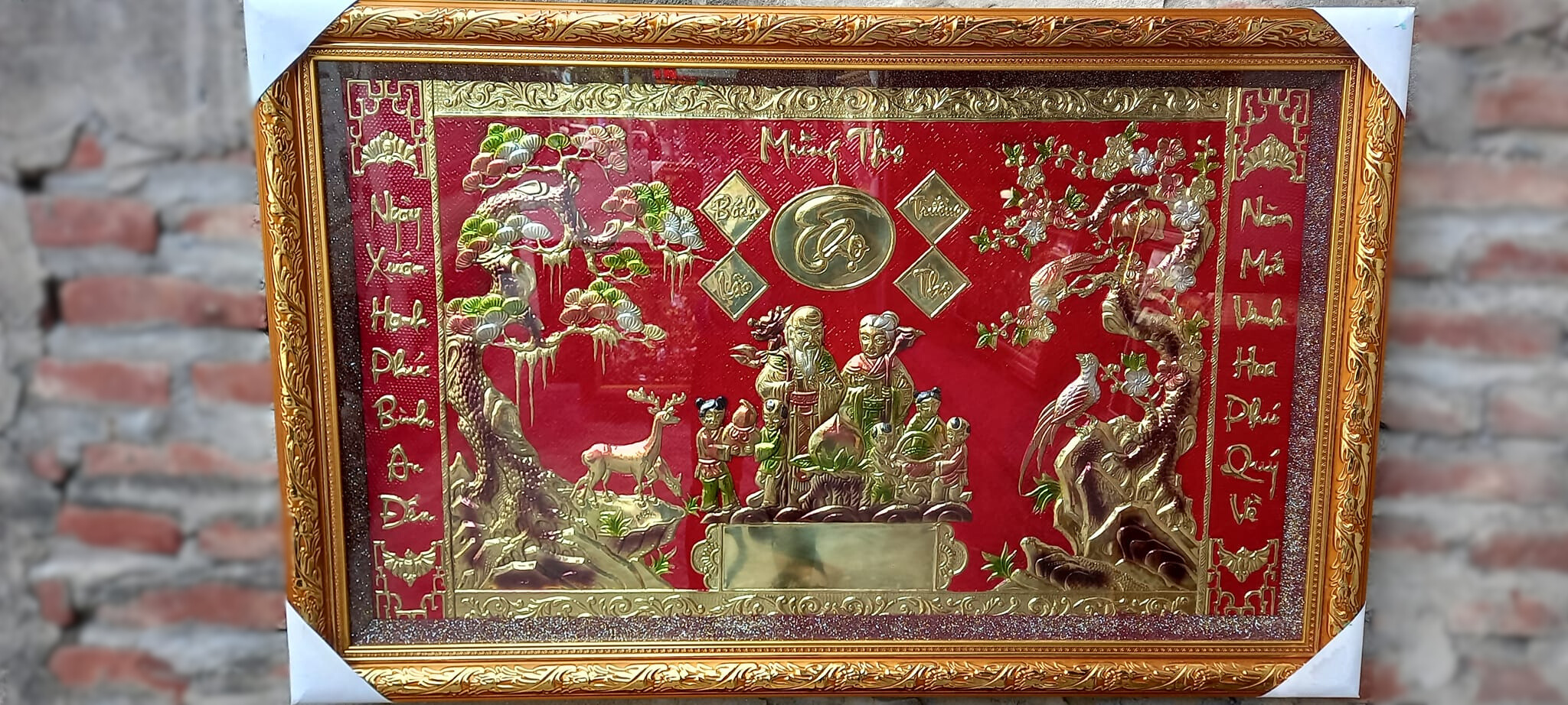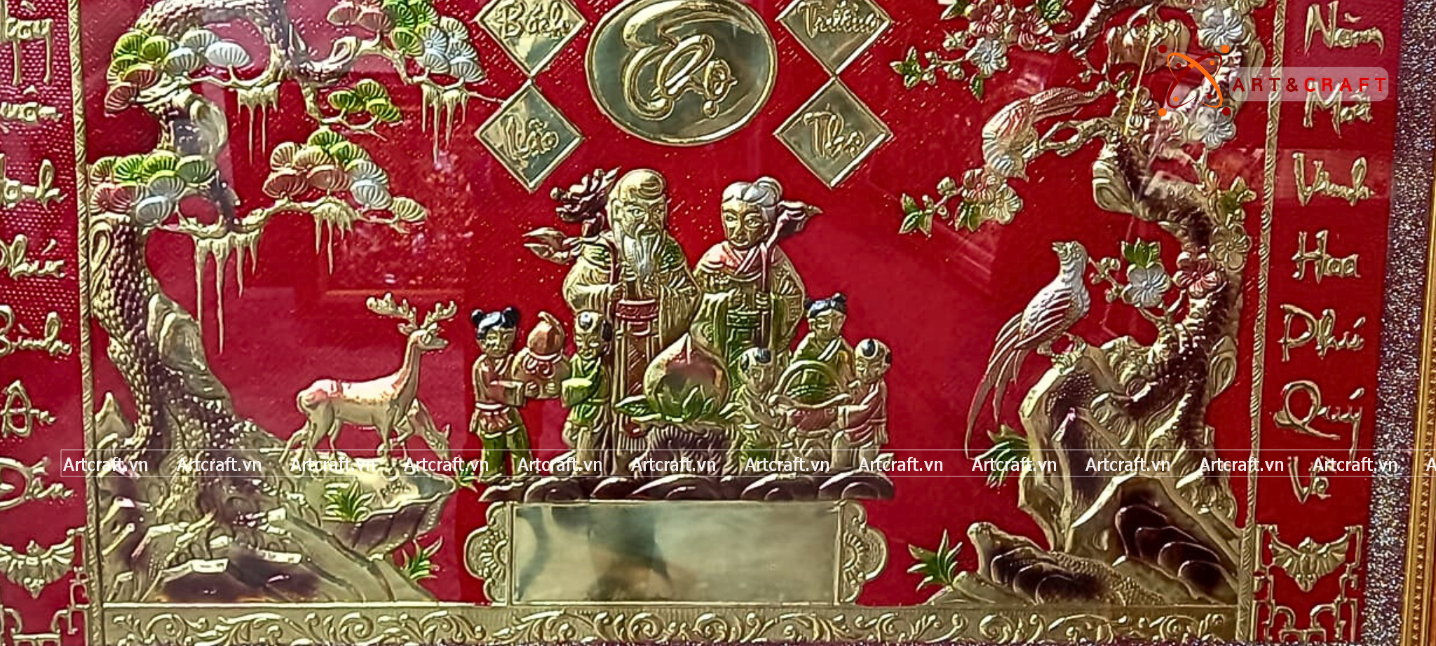 - Họa tiết tinh xảo: Tấm đồng được dát mỏng thúc chạm nổi với hình ảnh ông bà vui vẻ tươi tắn đứng cạnh con cháu phúc lộc đầy nhà.