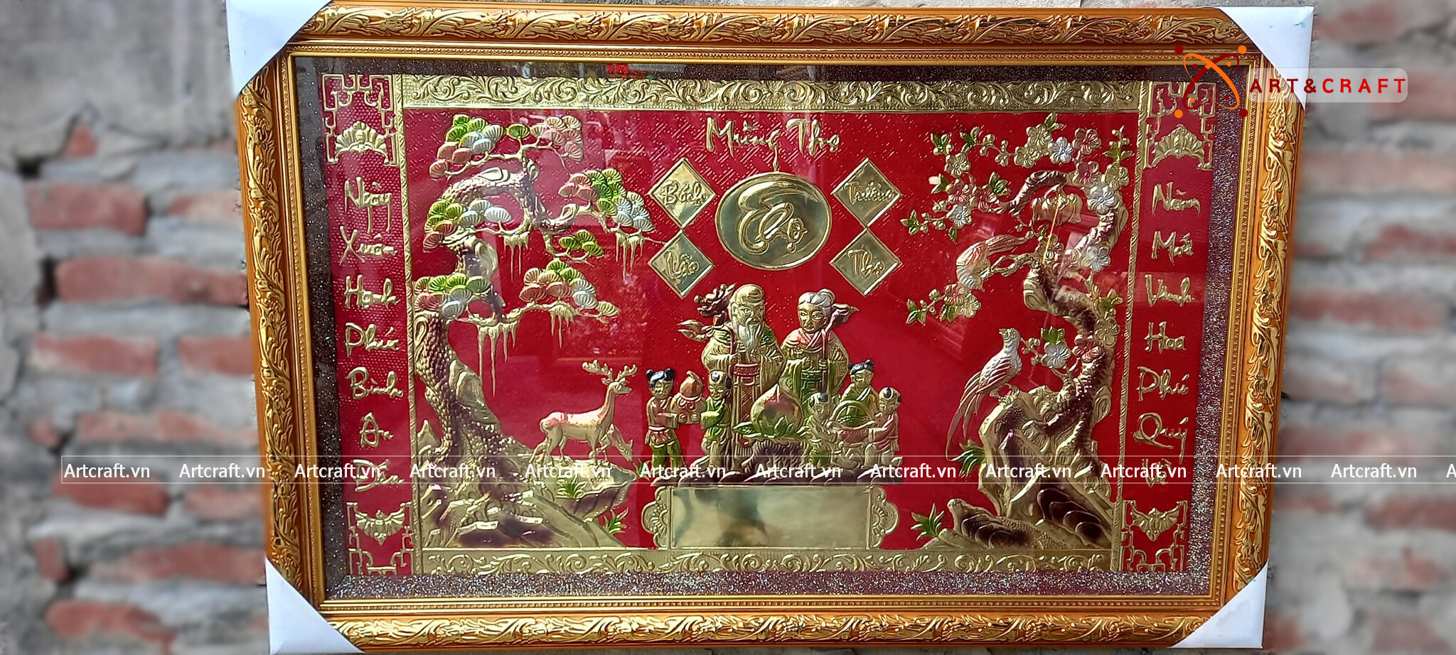 - Chất liệu cao cấp: Nguyên liệu chính tạo nên Quà Mừng Thọ Tranh Mừng Thọ chính là đồng, là kim loại quý thứ 3 trong tự nhiên. Đây là kim loại mềm, uốn dẻo tốt và được tinh luyện ở khoảng 1000°C có tính chịu nhiệt tốt, bền đẹp khi để ngoài môi trường.