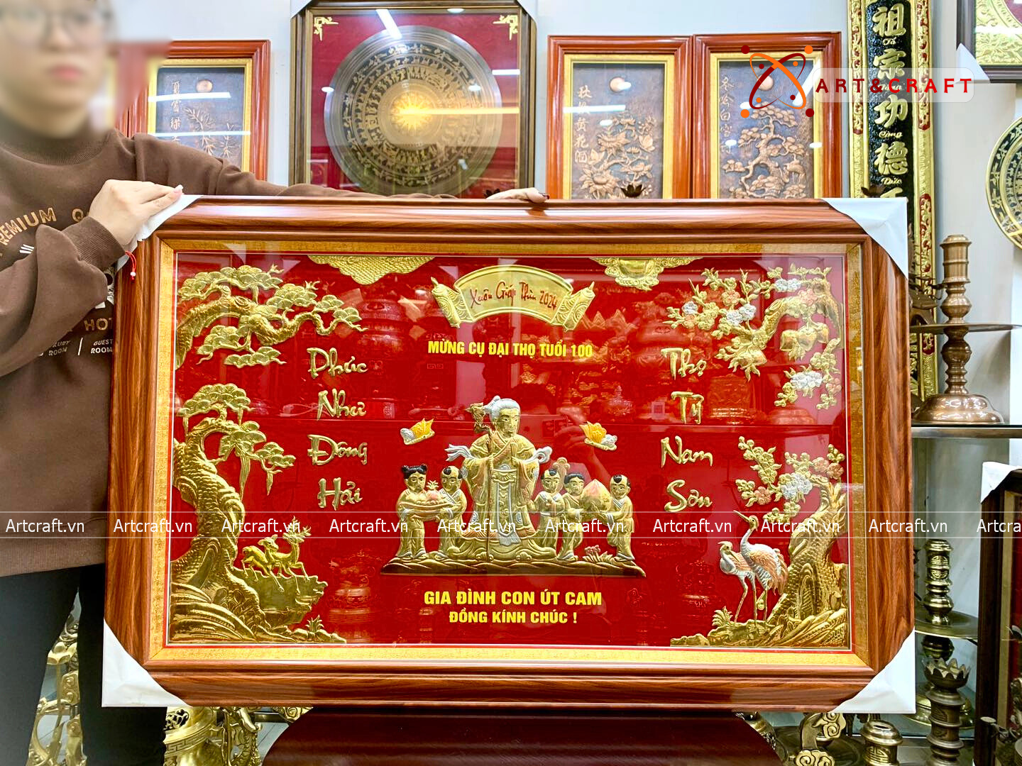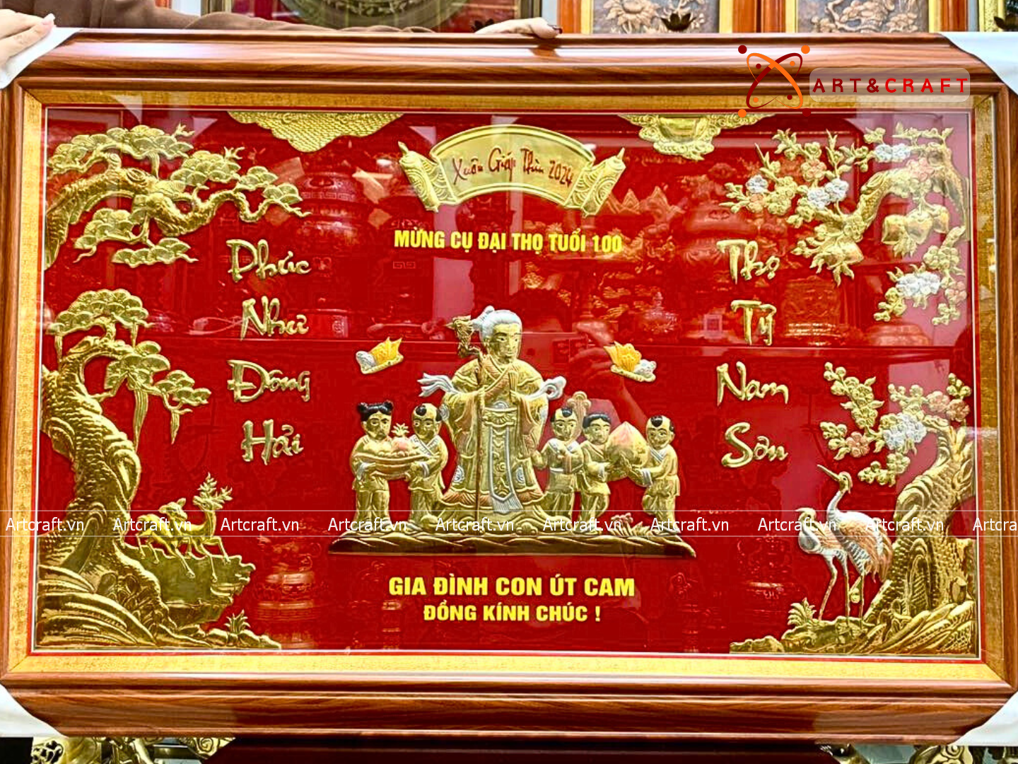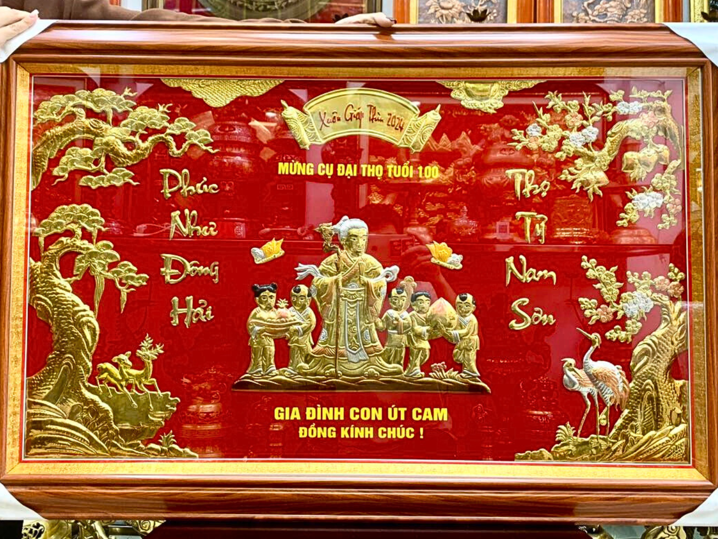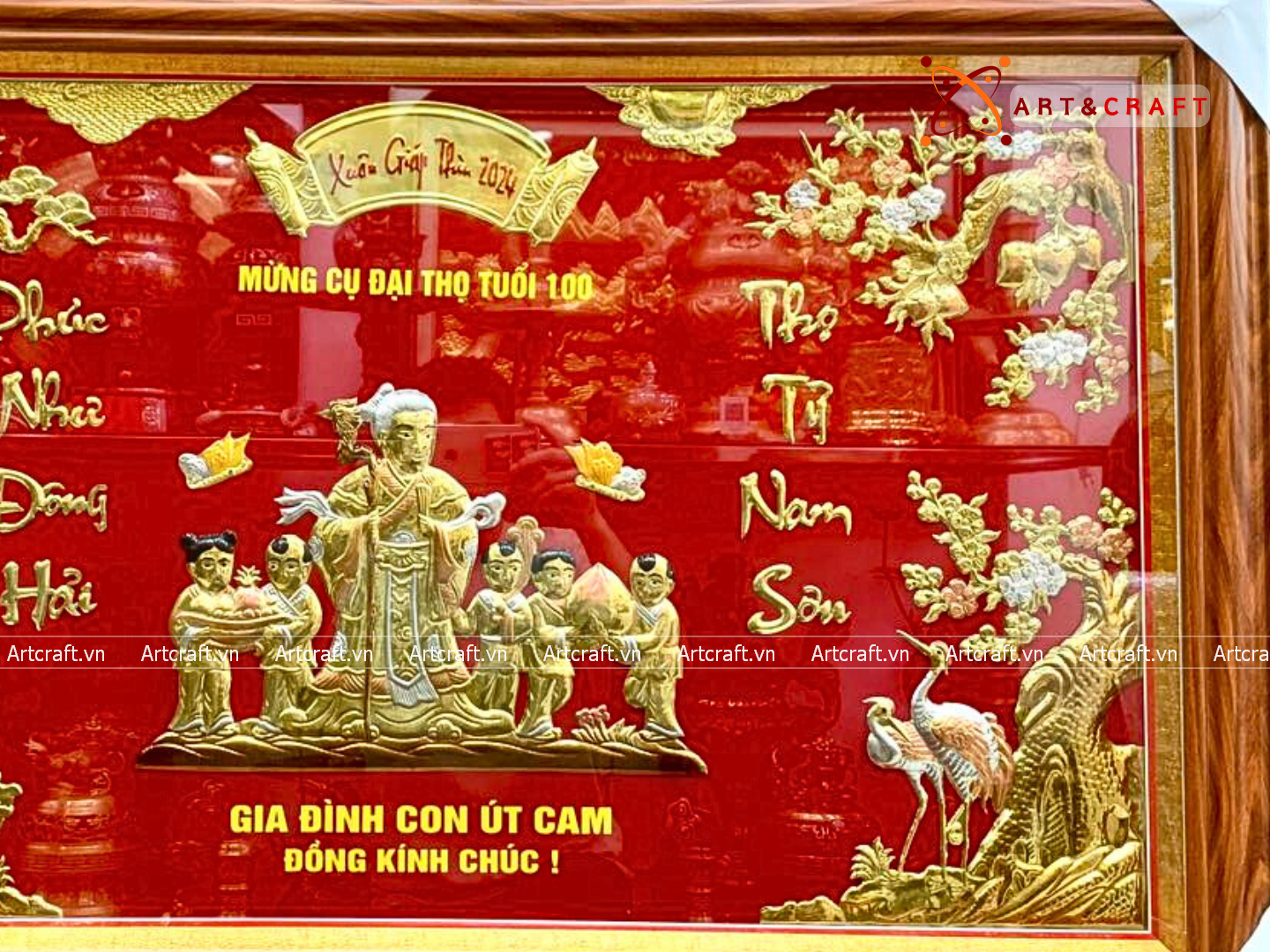 - Họa tiết tinh xảo: Tấm đồng được dát mỏng thúc chạm nổi với hình ảnh ông bà vui vẻ tươi tắn đứng cạnh con cháu phúc lộc đầy nhà.