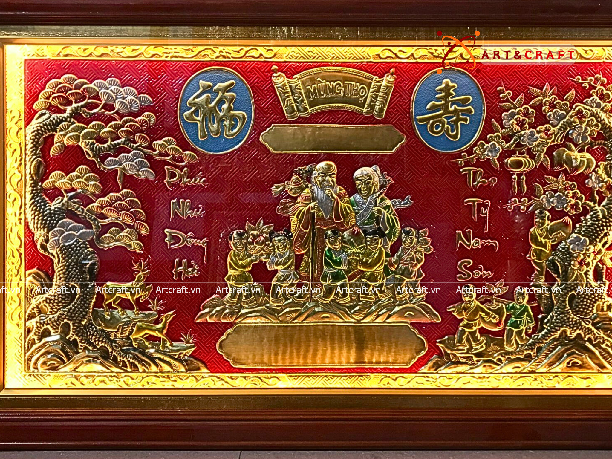 - Chất liệu cao cấp: Nguyên liệu chính tạo nên Quà Mừng Thọ Tranh Mừng Thọ chính là đồng, là kim loại quý thứ 3 trong tự nhiên. Đây là kim loại mềm, uốn dẻo tốt và được tinh luyện ở khoảng 1000°C có tính chịu nhiệt tốt, bền đẹp khi để ngoài môi trường.