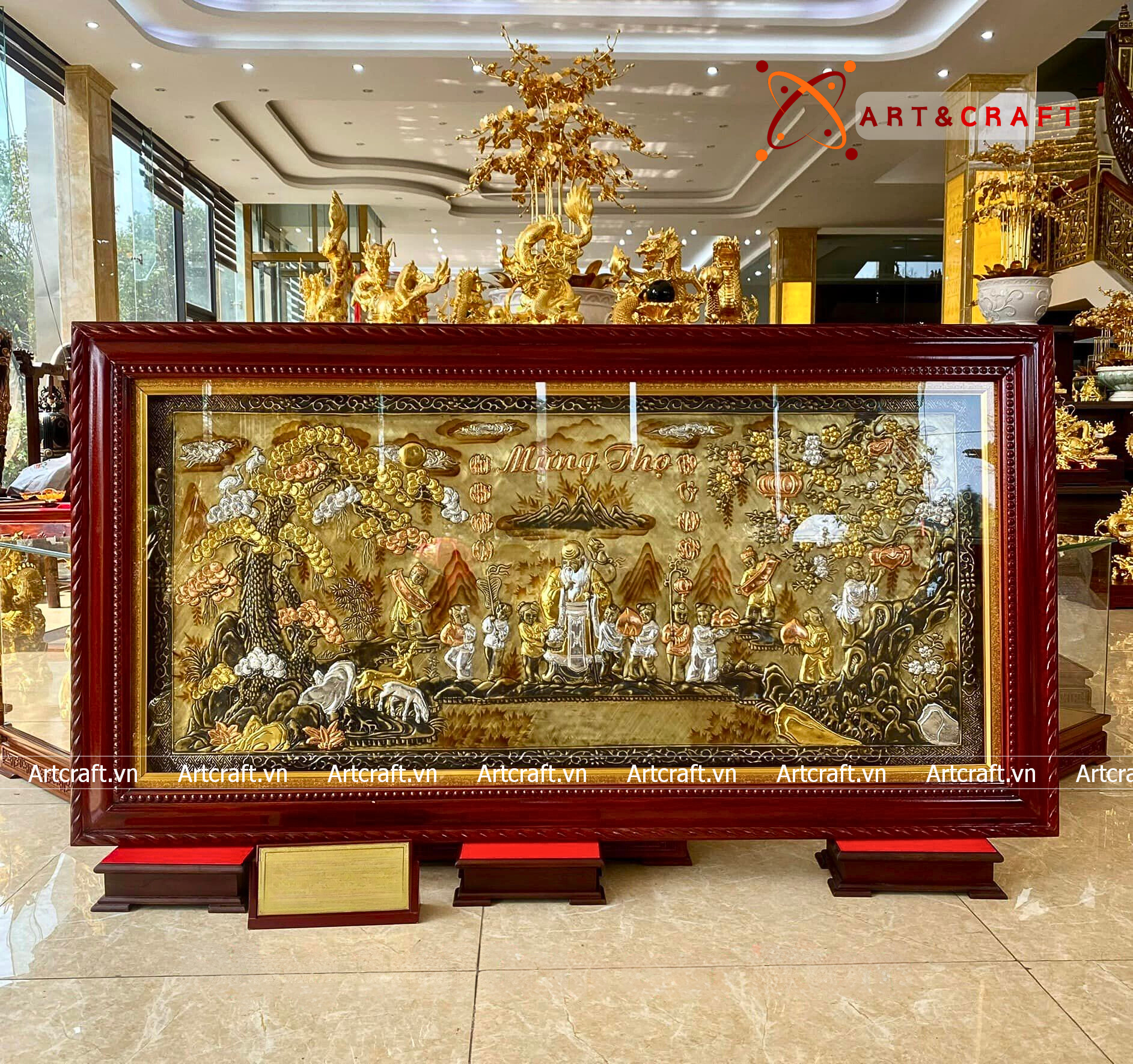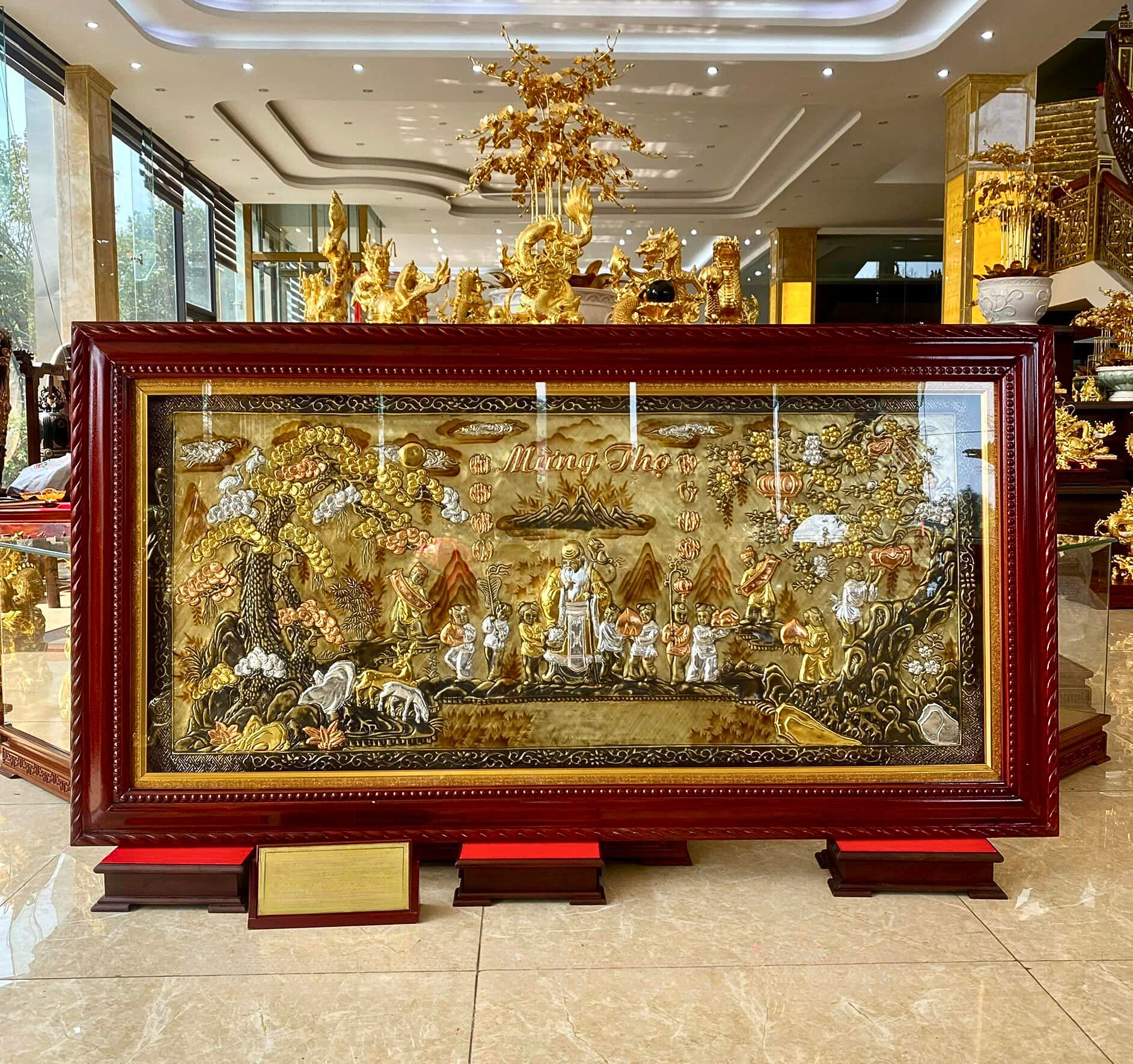 - Chất liệu cao cấp: Nguyên liệu chính tạo nên Quà Mừng Thọ Tranh Mừng Thọ chính là đồng, là kim loại quý thứ 3 trong tự nhiên. Đây là kim loại mềm, uốn dẻo tốt và được tinh luyện ở khoảng 1000°C có tính chịu nhiệt tốt, bền đẹp khi để ngoài môi trường.