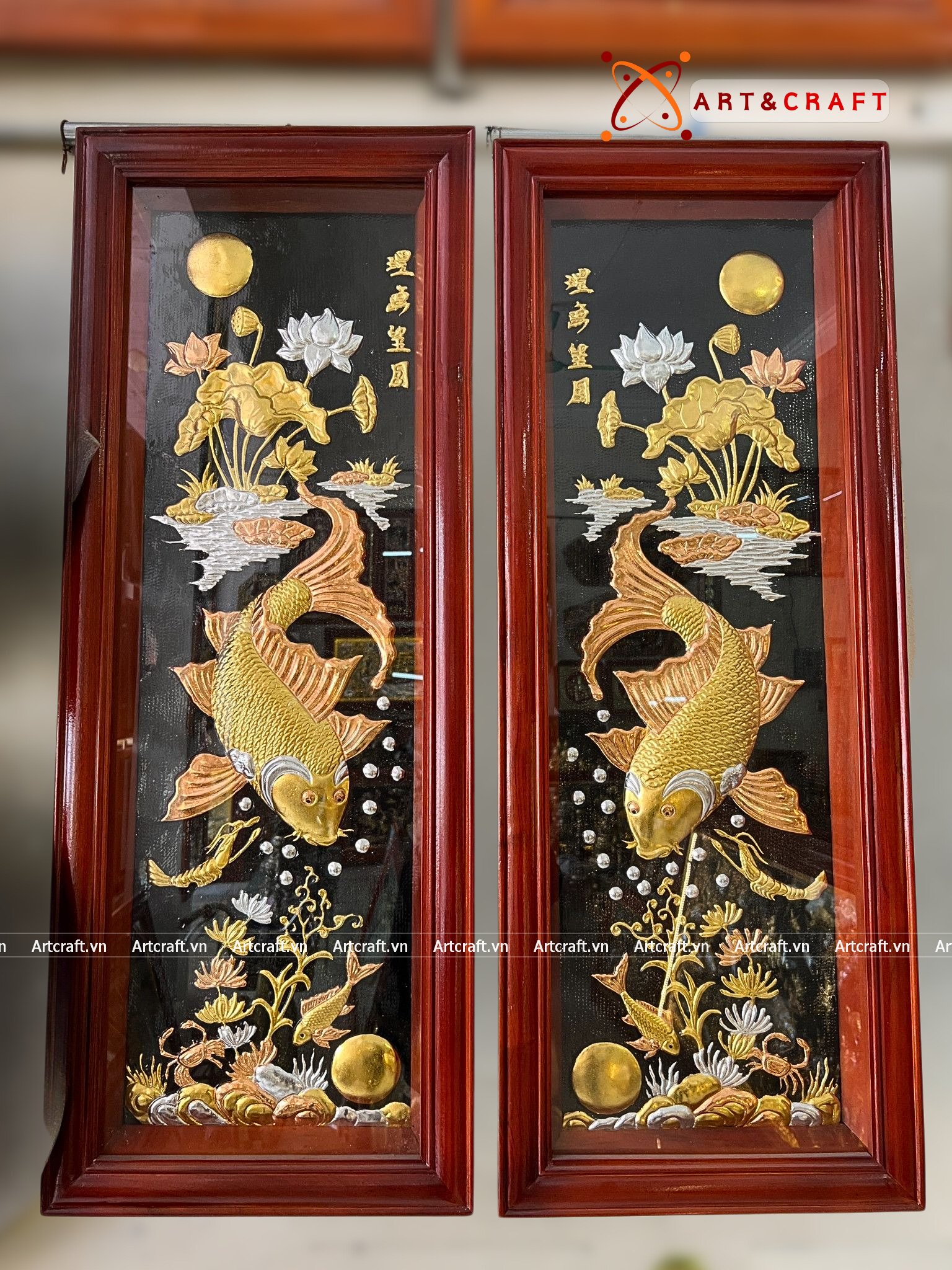 - Họa tiết tinh xảo: Quà Tặng Phong Thủy Tranh Cá Chép Trông Trăng được thúc chạm tinh tế với hình tượng đôi cá chép đang vọng nguyệt cùng với khung hoa lá xung quanh tạo nên bức tranh phong thủy đẹp mắt.