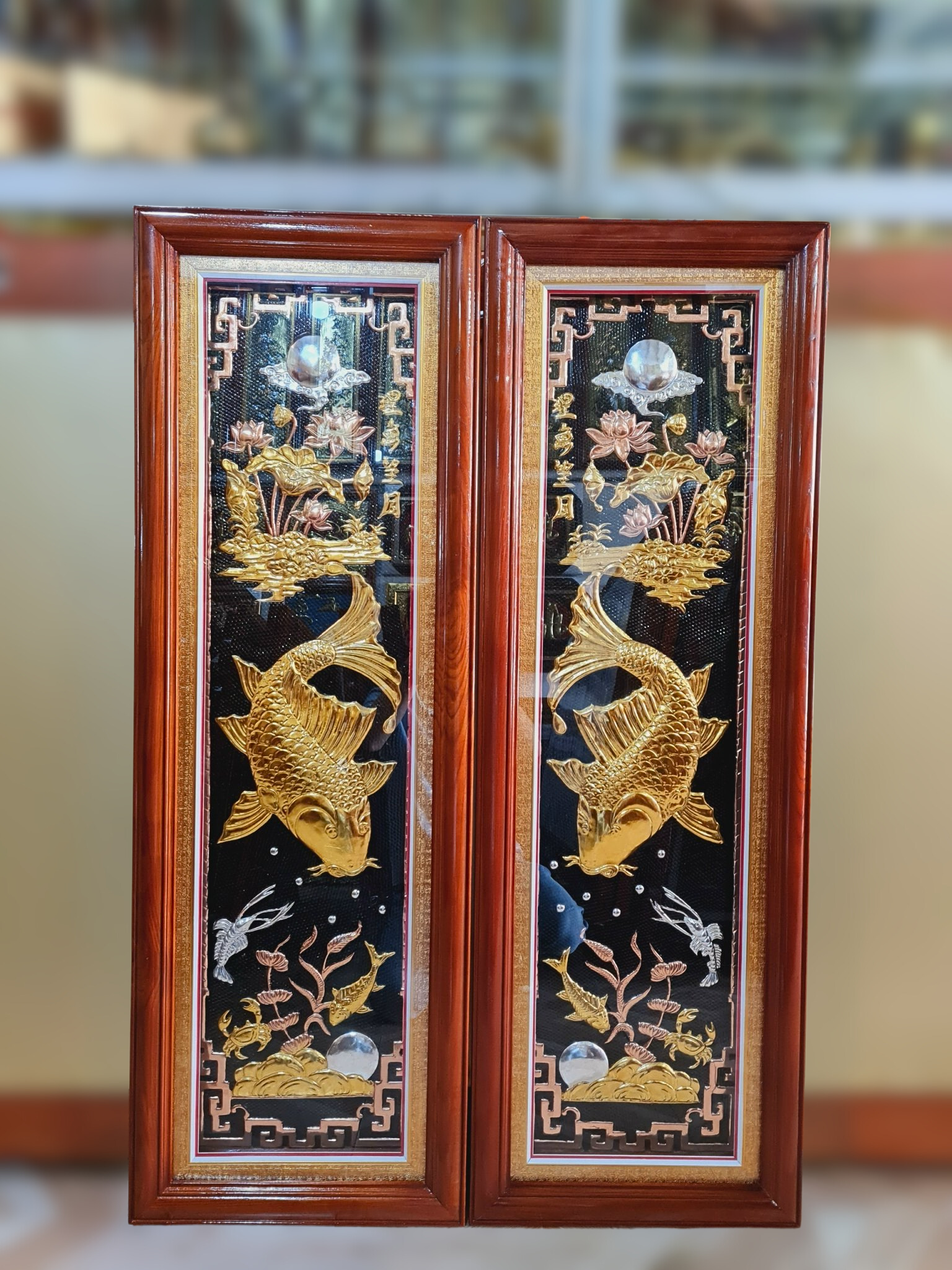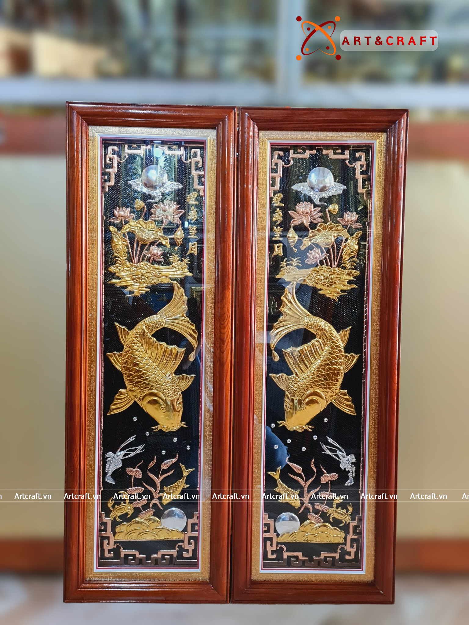 - Họa tiết tinh xảo: Quà Tặng Phong Thủy Tranh Cá Chép Trông Trăng được thúc chạm tinh tế với hình tượng đôi cá chép đang vọng nguyệt cùng với khung hoa lá xung quanh tạo nên bức tranh phong thủy đẹp mắt.