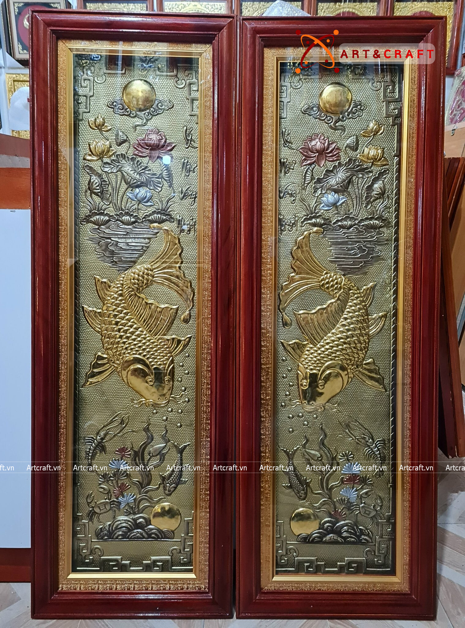 - Họa tiết tinh xảo: Quà Tặng Phong Thủy Tranh Cá Chép Trông Trăng được thúc chạm tinh tế với hình tượng đôi cá chép đang vọng nguyệt cùng với khung hoa lá xung quanh tạo nên bức tranh phong thủy đẹp mắt.