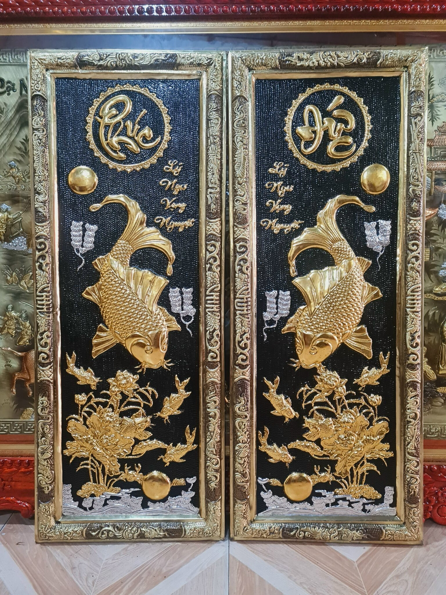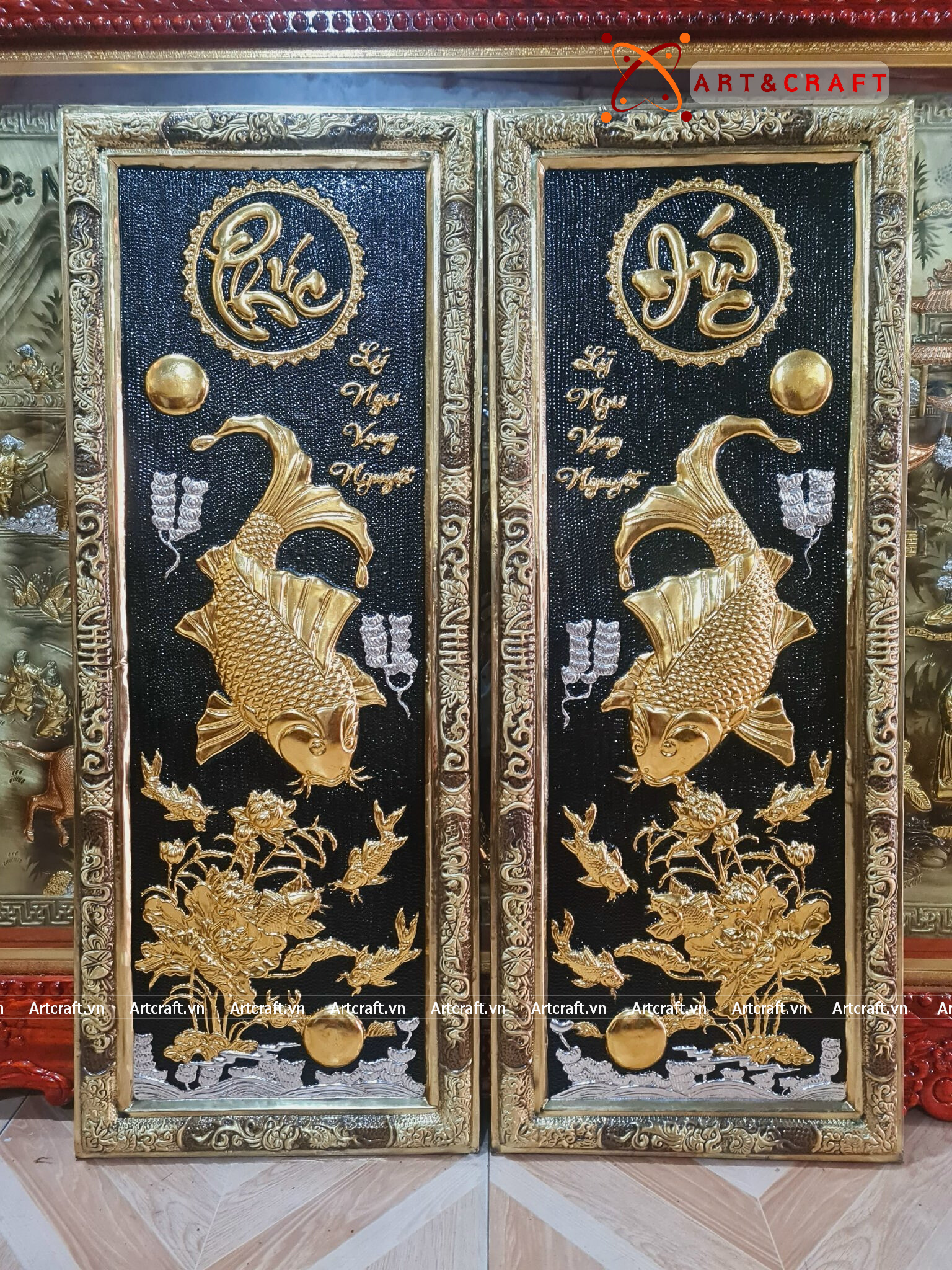 - Họa tiết tinh xảo: Quà Tặng Phong Thủy Tranh Cá Chép Trông Trăng được thúc chạm tinh tế với hình tượng đôi cá chép đang vọng nguyệt cùng với khung hoa lá xung quanh tạo nên bức tranh phong thủy đẹp mắt.