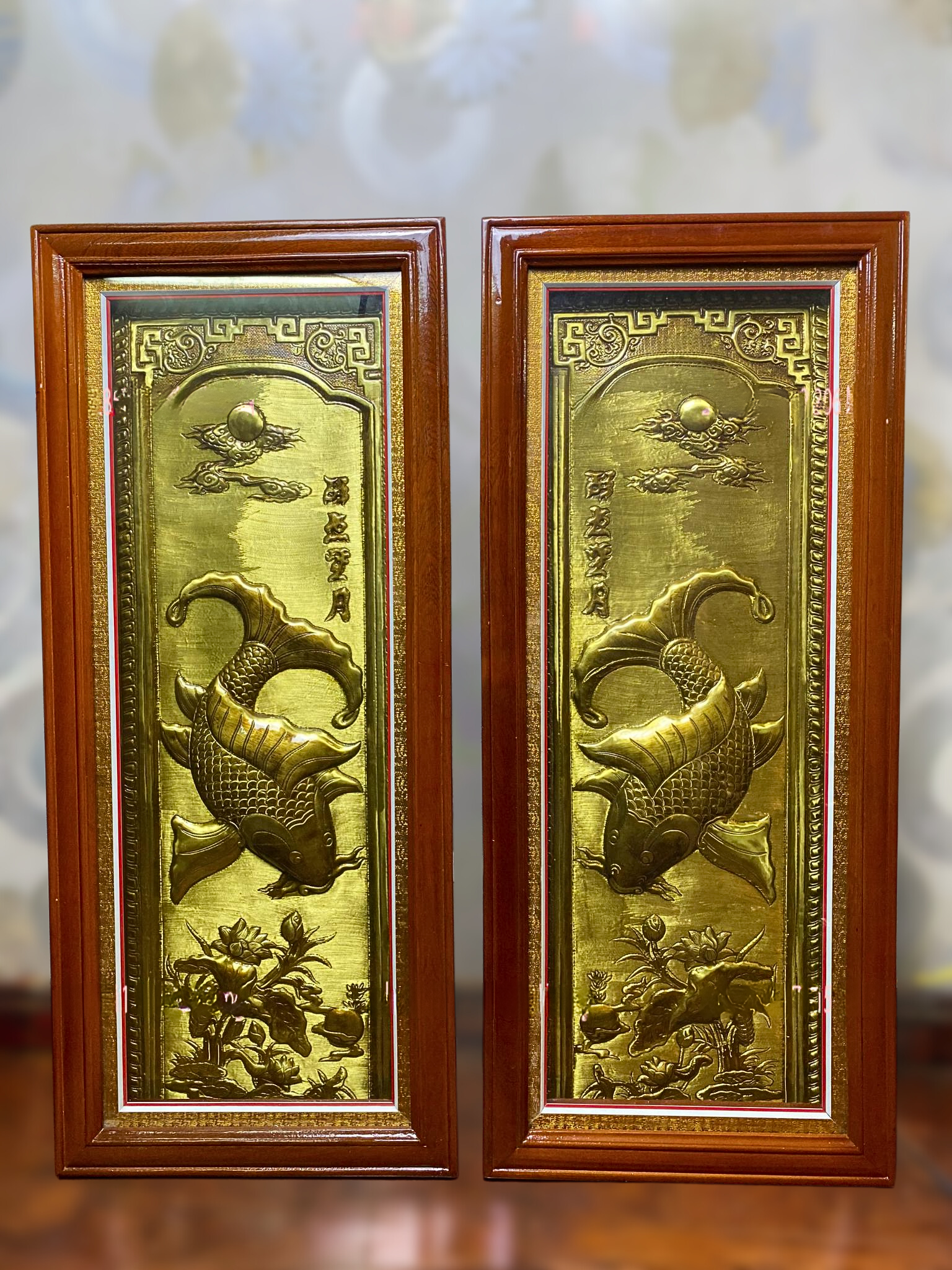 - Họa tiết tinh xảo: Quà Tặng Phong Thủy Tranh Cá Chép Trông Trăng được thúc chạm tinh tế với hình tượng đôi cá chép đang vọng nguyệt cùng với khung hoa lá xung quanh tạo nên bức tranh phong thủy đẹp mắt.
