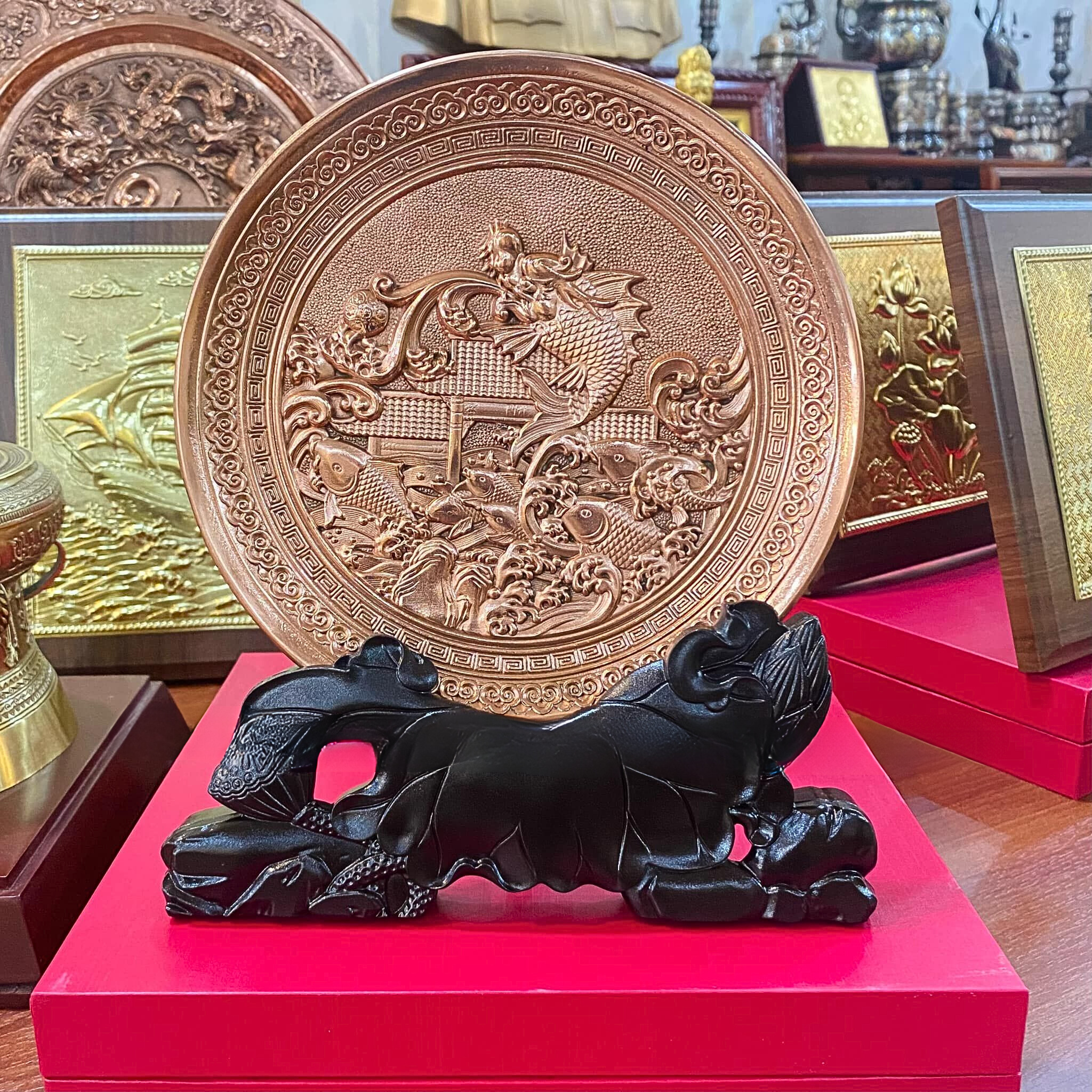 - Chất liệu cao cấp: Nguyên liệu chính tạo nên Quà Tặng Sếp Tranh Cá Chép Hóa Rồng chính là đồng, là kim loại quý thứ 3 trong tự nhiên. Đây là kim loại mềm, uốn dẻo tốt và được tinh luyện ở khoảng 1000°C có tính chịu nhiệt tốt, bền đẹp khi để ngoài môi trường.