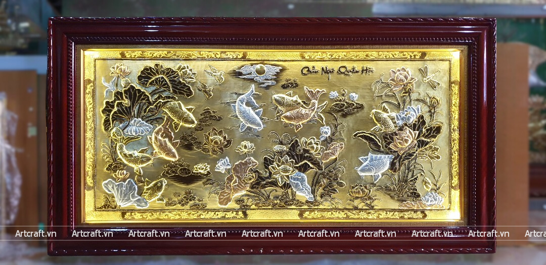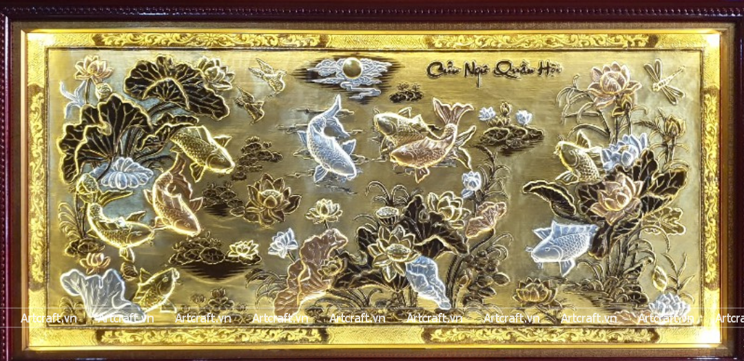- Họa tiết tinh xảo: Tranh Cửu Ngư Quần Hội được thúc chạm tinh tế với hình tượng cá chép quần tụ cùng với khung cảnh hoa sen xung quanh tạo nên bức tranh đẹp mắt sống động.