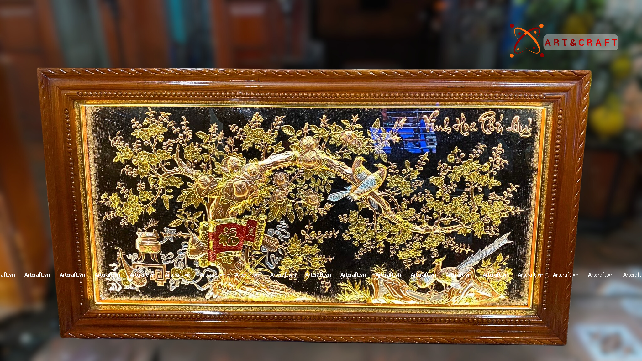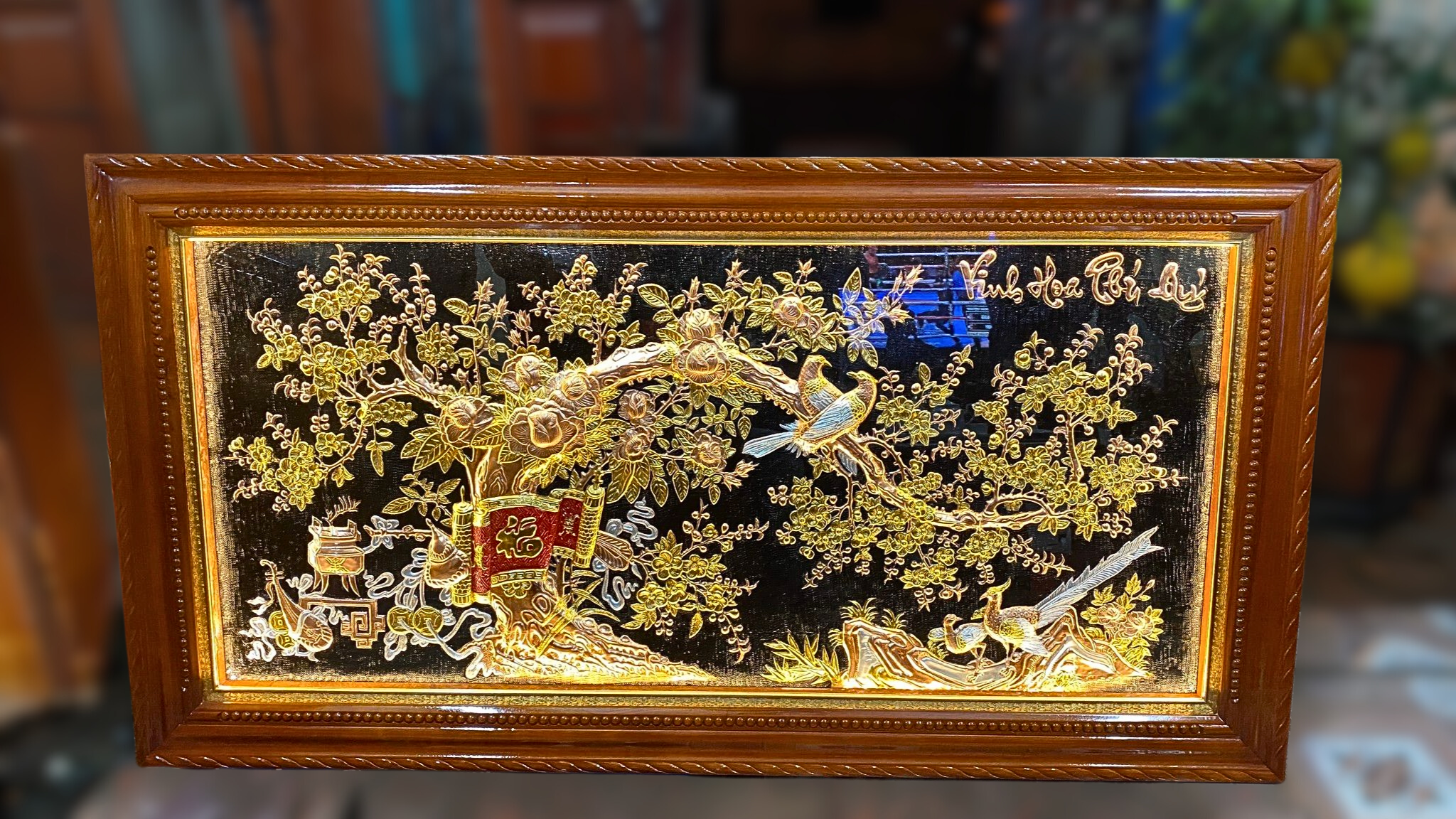 - Họa tiết tinh xảo: Quà Tặng Tranh Vinh Hoa Phú Quý được thúc chạm tinh xảo với hình tượng từng đôi chim và cành mai vàng, cuốn thư, đỉnh đồng tạo nên bức tranh sung túc, hạnh phúc.