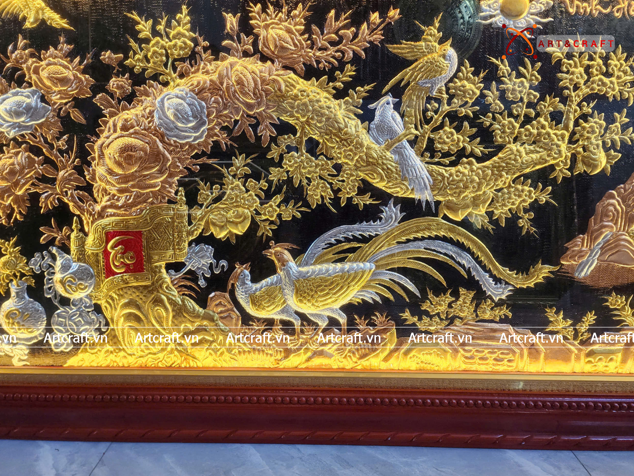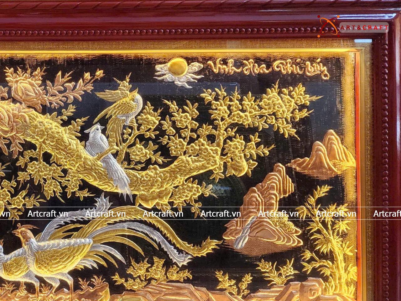 - Họa tiết tinh xảo: Quà Tặng Tranh Vinh Hoa Phú Quý được thúc chạm tinh xảo với hình tượng từng đôi chim và cành mai vàng, cuốn thư, đỉnh đồng tạo nên bức tranh sung túc, hạnh phúc.