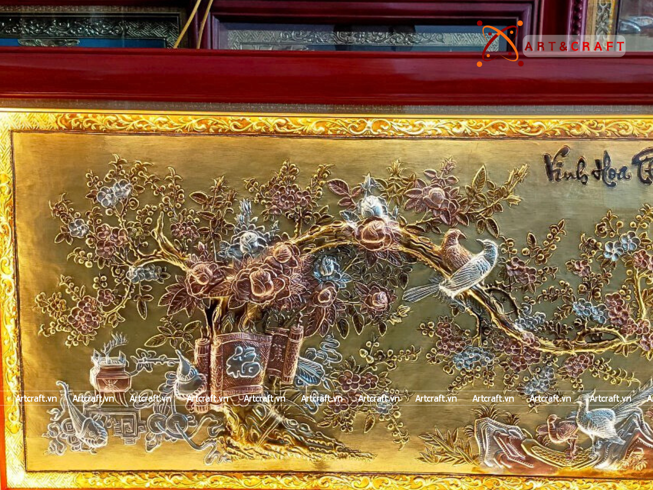 - Họa tiết tinh xảo: Quà Tặng Tranh Vinh Hoa Phú Quý được thúc chạm tinh xảo với hình tượng từng đôi chim và cành mai vàng, cuốn thư, đỉnh đồng tạo nên bức tranh sung túc, hạnh phúc.