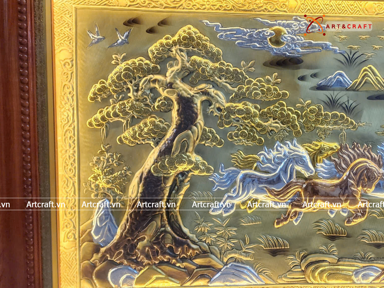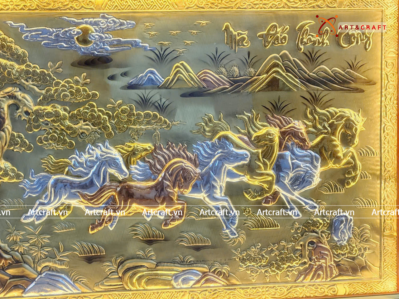 - Họa tiết tinh xảo: Tấm đồng được dát mỏng thúc chạm từng chi tiết nhỏ. Bát mã khỏe khoắn đang phi nước đại tạo nên bức tranh sống động, đặc sắc.