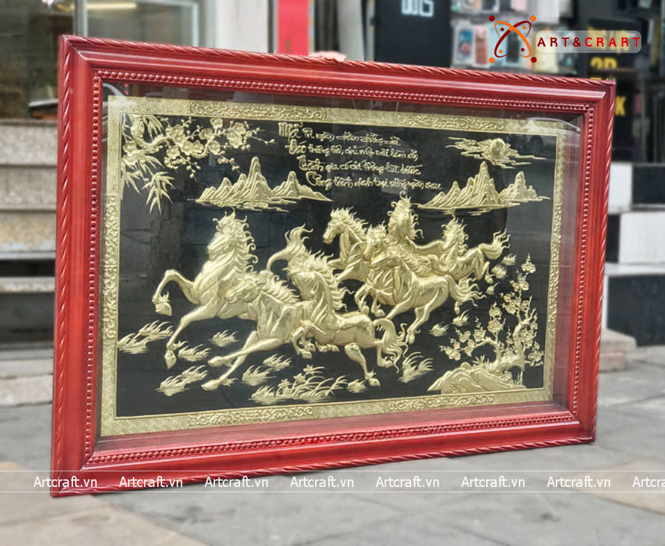 - Họa tiết tinh xảo: Tấm đồng được dát mỏng thúc chạm từng chi tiết nhỏ. Bát mã khỏe khoắn đang phi nước đại tạo nên bức tranh sống động, đặc sắc.
