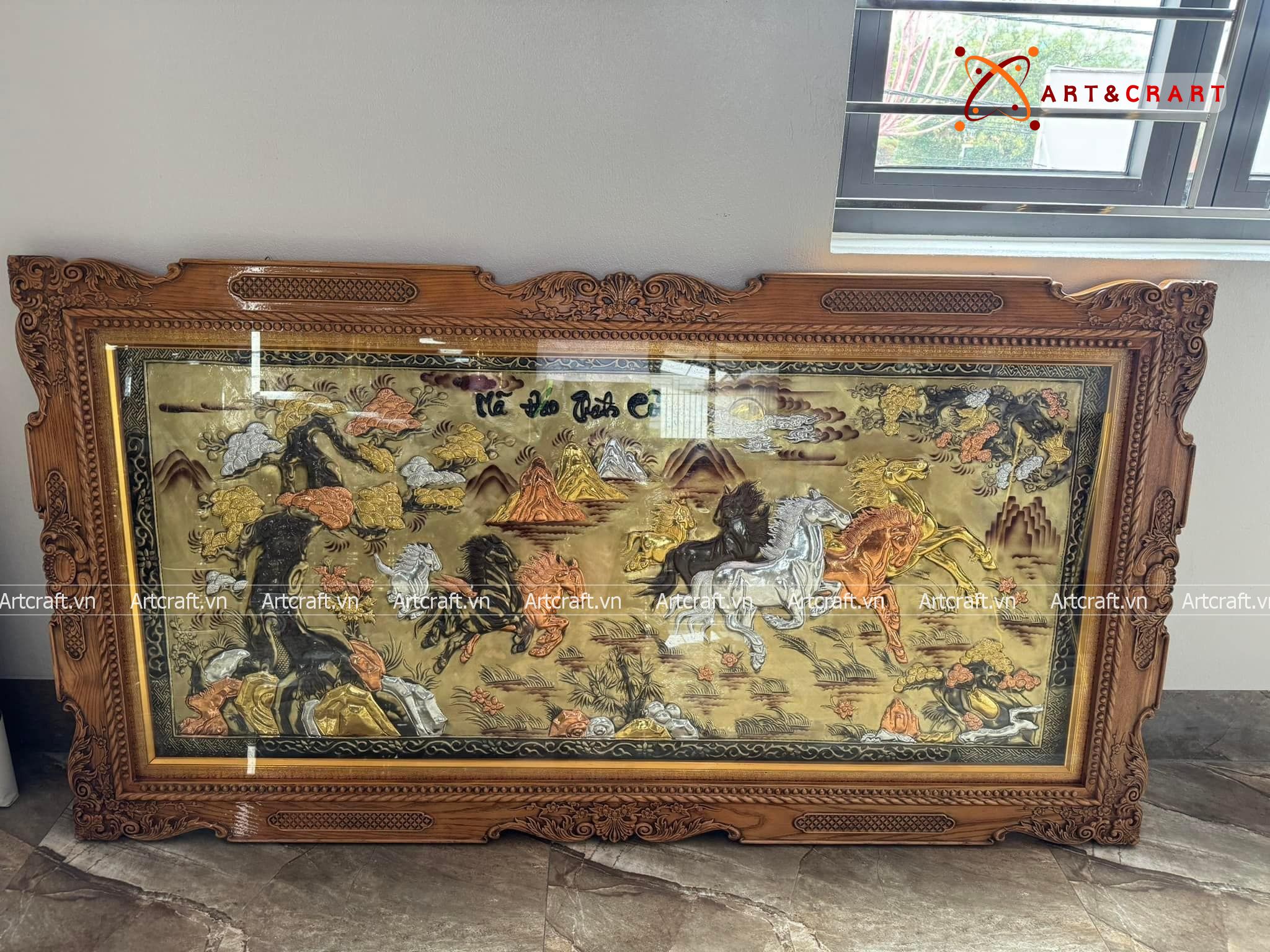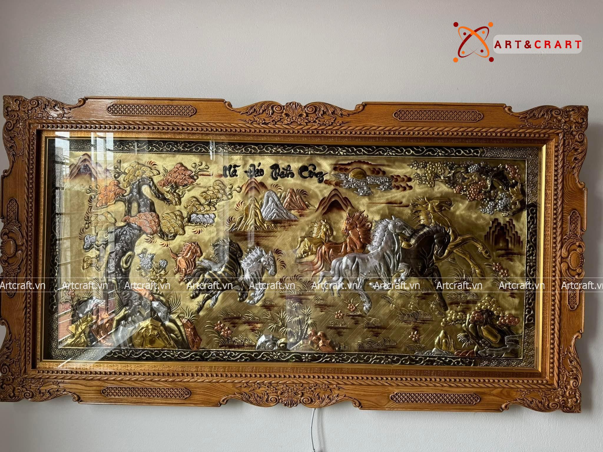 - Họa tiết tinh xảo: Tấm đồng được dát mỏng thúc chạm từng chi tiết nhỏ. Bát mã khỏe khoắn đang phi nước đại tạo nên bức tranh sống động, đặc sắc.