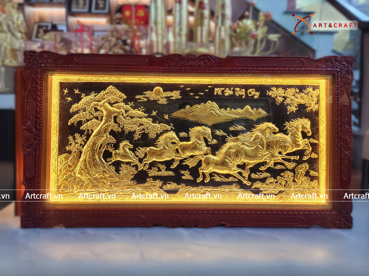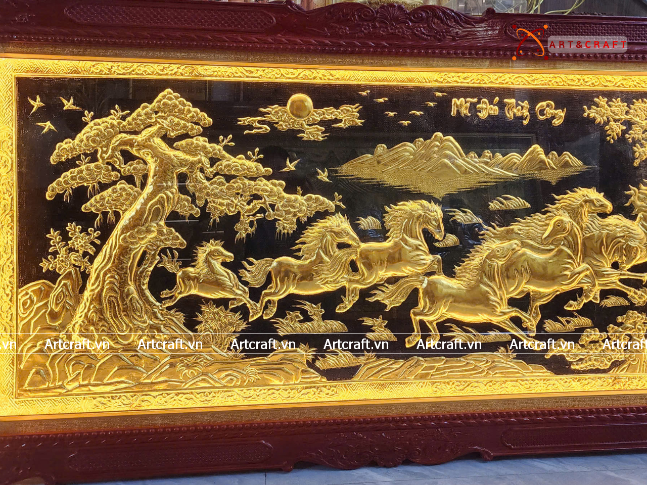 - Họa tiết tinh xảo: Tấm đồng được dát mỏng thúc chạm từng chi tiết nhỏ. Bát mã khỏe khoắn đang phi nước đại tạo nên bức tranh sống động, đặc sắc.