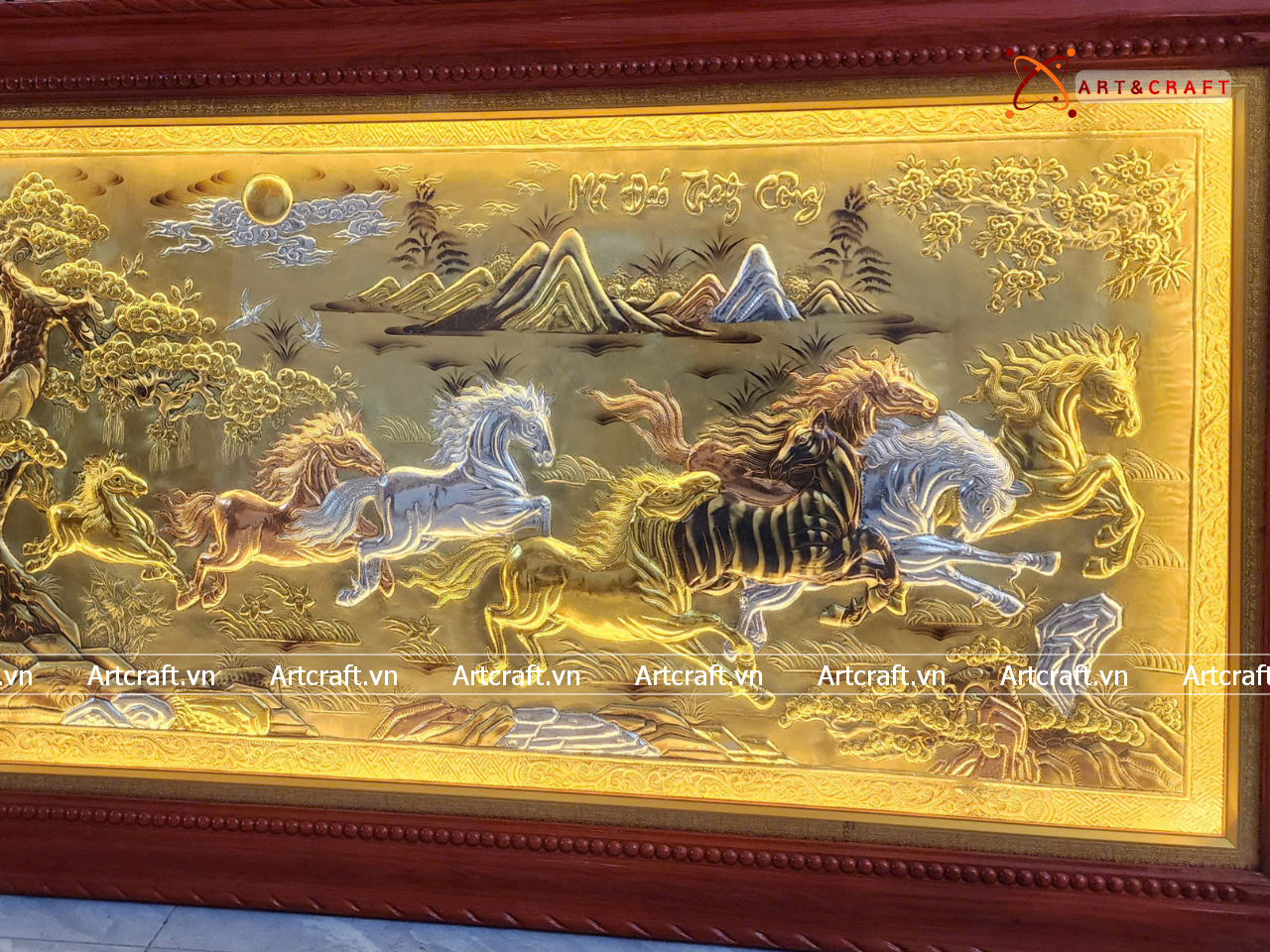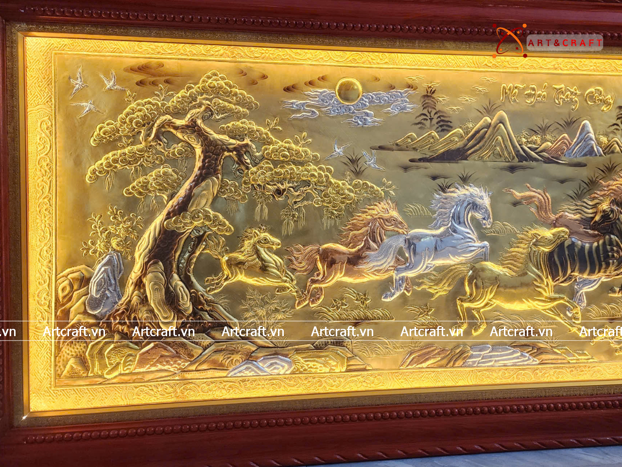 - Họa tiết tinh xảo: Tấm đồng được dát mỏng thúc chạm từng chi tiết nhỏ. Bát mã khỏe khoắn đang phi nước đại tạo nên bức tranh sống động, đặc sắc.