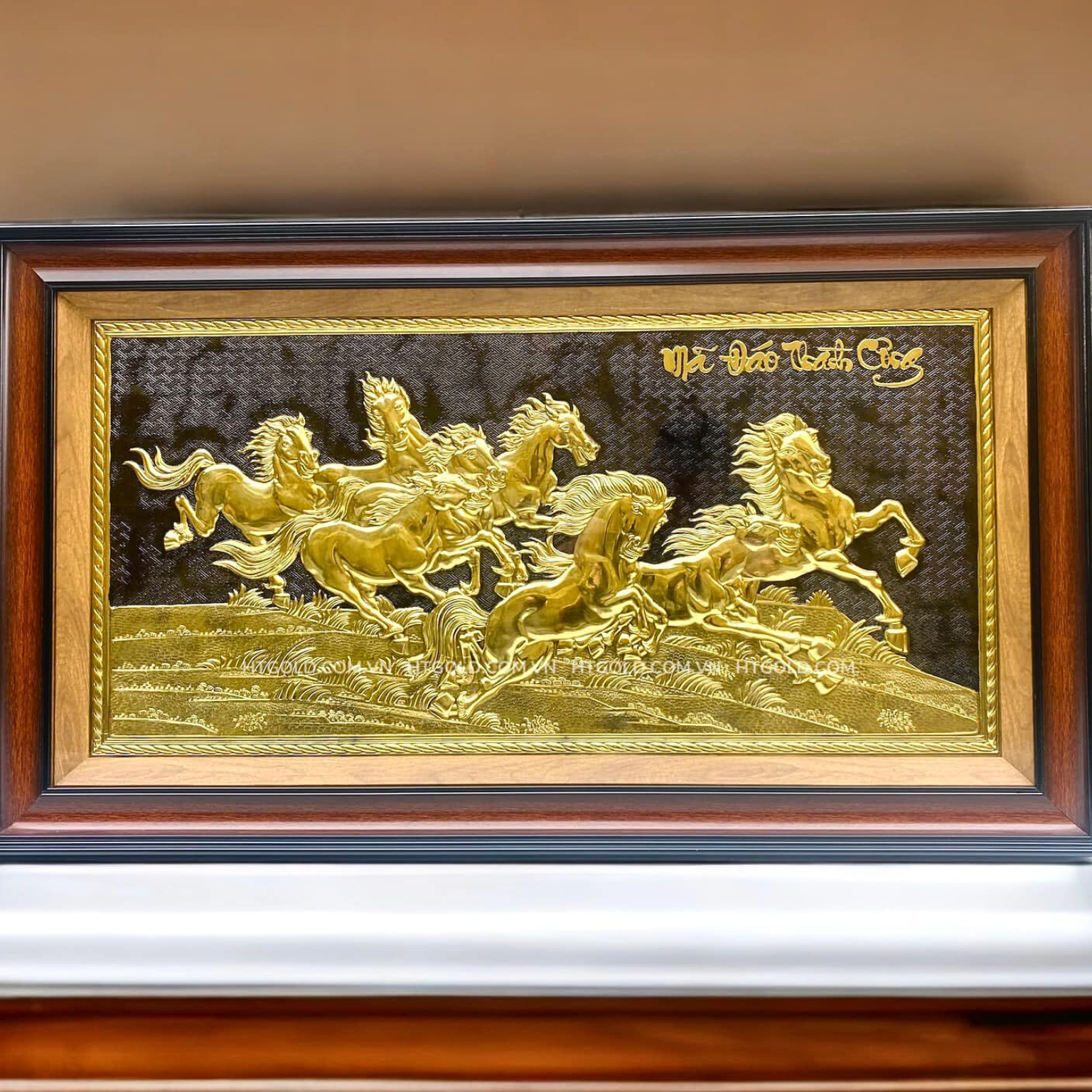 - Họa tiết tinh xảo: Tấm đồng được dát mỏng thúc chạm từng chi tiết nhỏ. Bát mã khỏe khoắn đang phi nước đại tạo nên bức tranh sống động, đặc sắc.