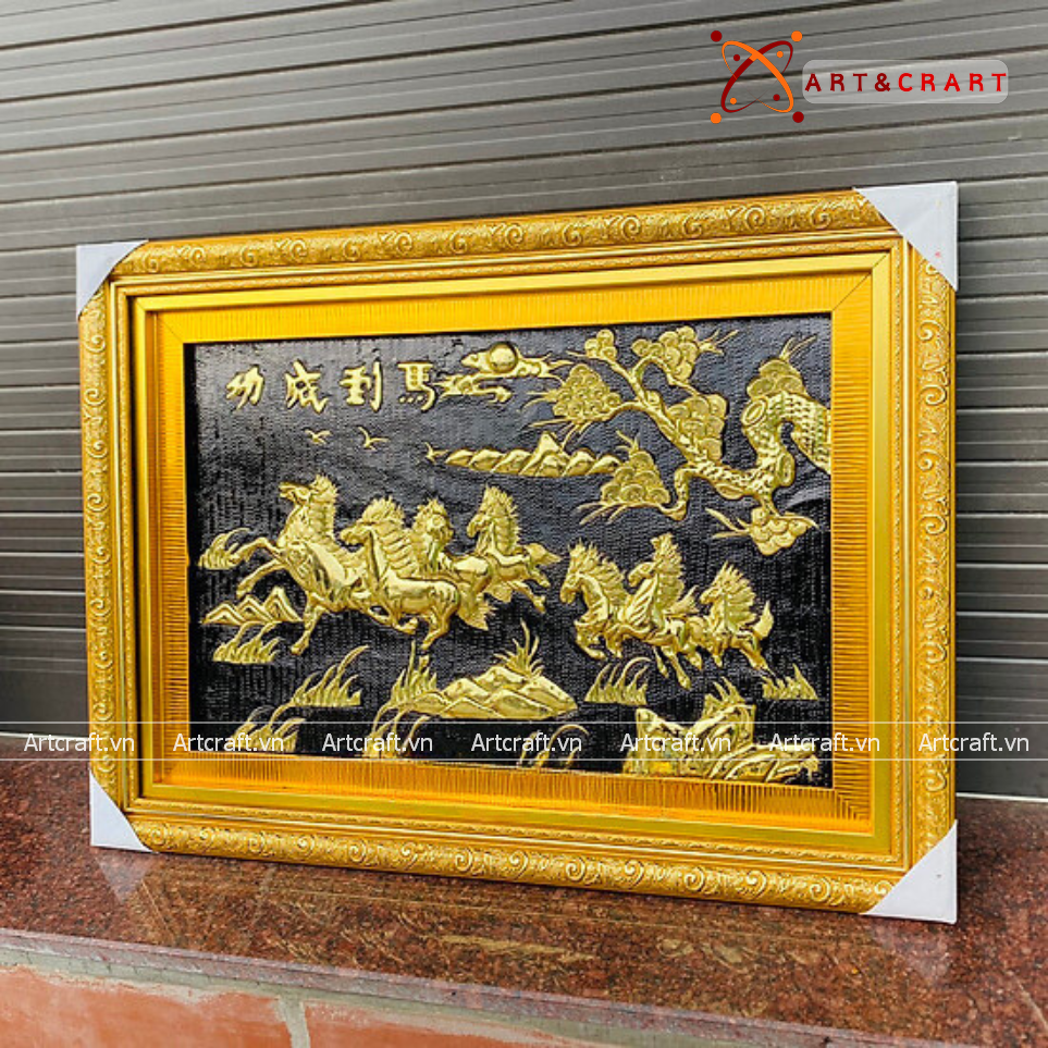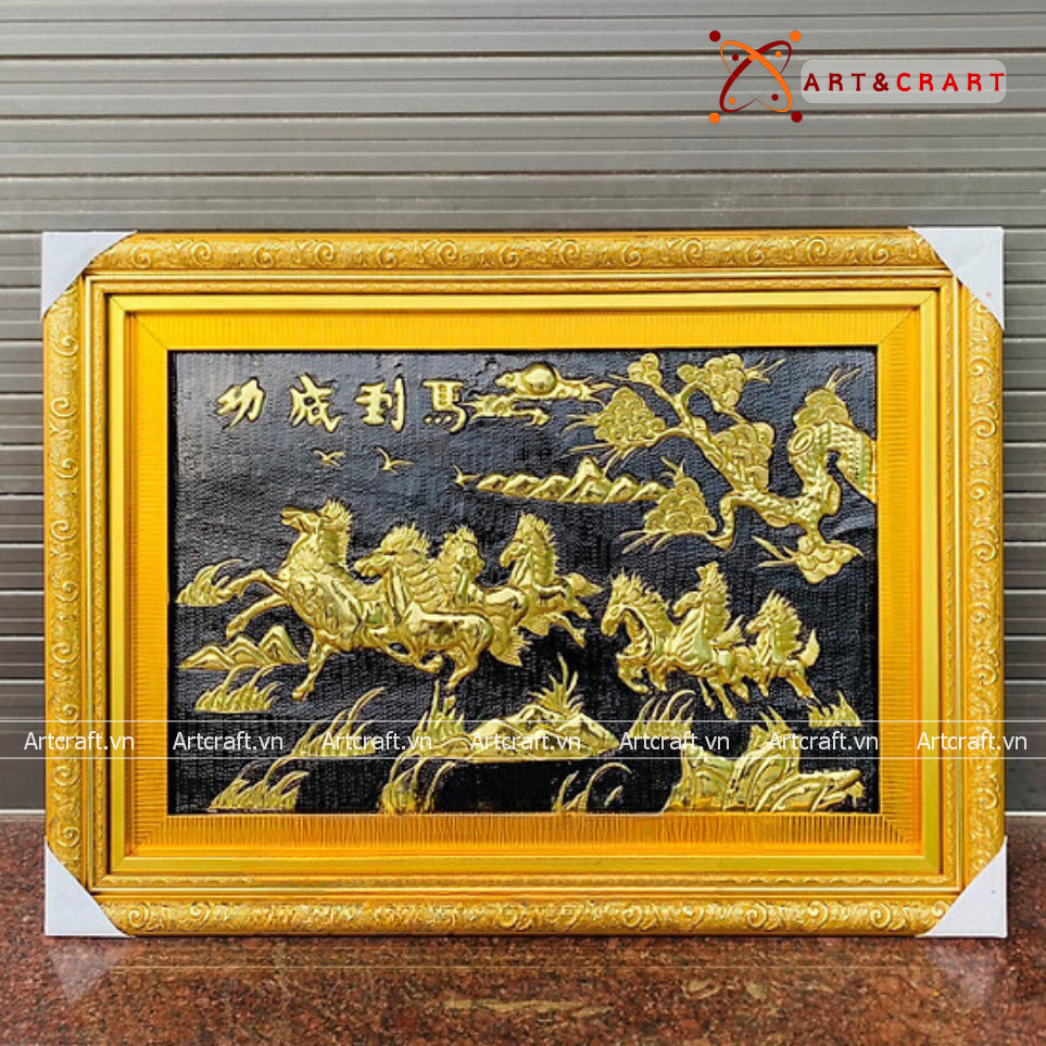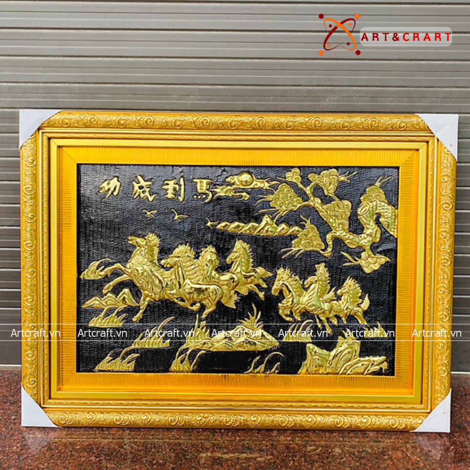 - Họa tiết tinh xảo: Tấm đồng được dát mỏng thúc chạm từng chi tiết nhỏ. Bát mã khỏe khoắn đang phi nước đại tạo nên bức tranh sống động, đặc sắc.