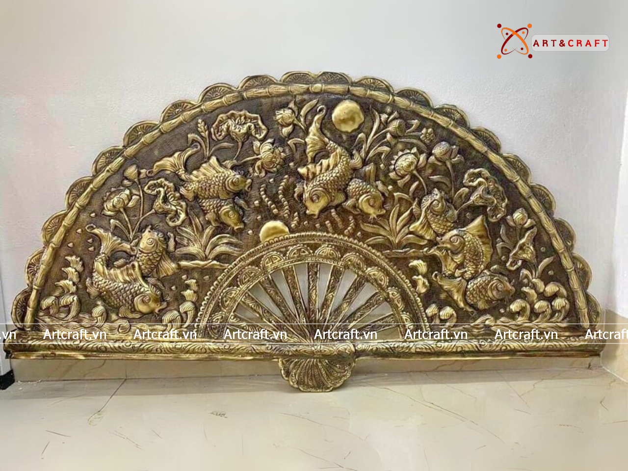 - Họa tiết tinh xảo: Tấm đồng được dát mỏng thúc chạm từng chi tiết nhỏ. Bức tranh khắc họa 9 chú cá chép bơi lội giữa hồ sen, mộc mạc tạo nên bức tranh sống động, đặc sắc.