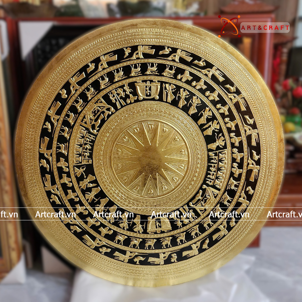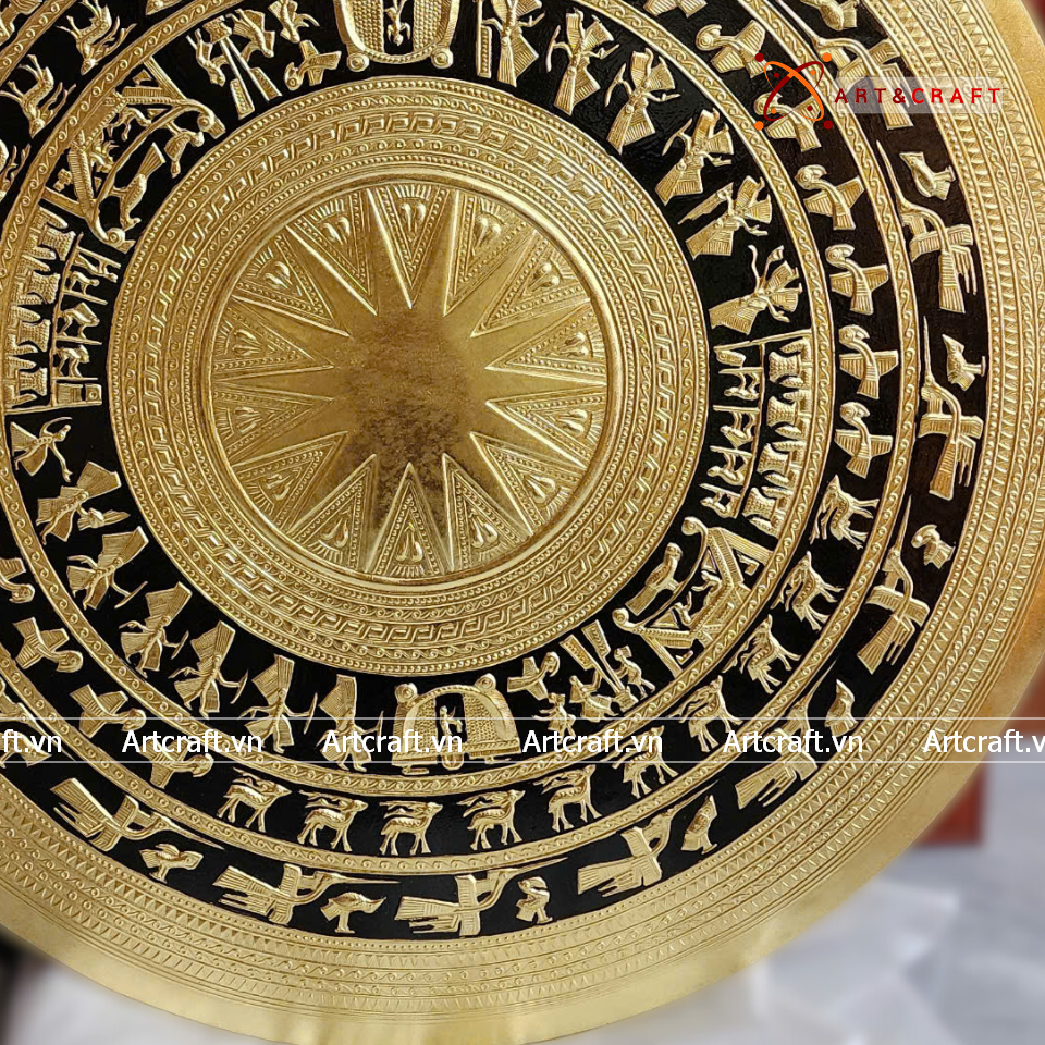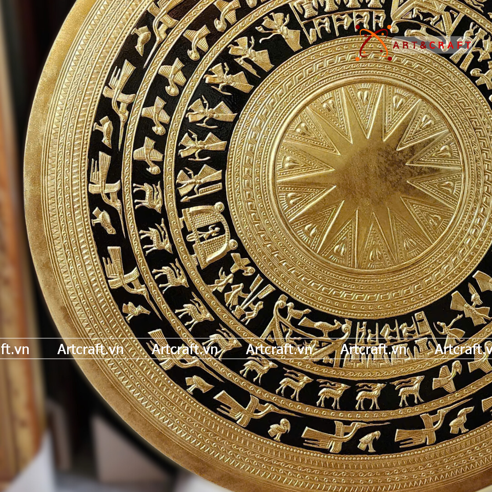 - Họa tiết tinh xảo: Tấm đồng được dát mỏng thúc chạm từng chi tiết nhỏ với các biểu tượng chim lạc, cảnh săn bắn, mặt trời miêu tả đỉnh cao nền văn minh Đông Sơn Âu Lạc dân tộc ta.