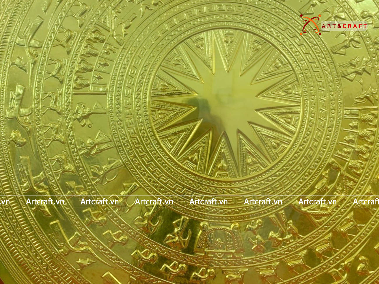 - Họa tiết tinh xảo: Tấm đồng được dát mỏng thúc chạm từng chi tiết nhỏ với các biểu tượng chim lạc, cảnh săn bắn, mặt trời miêu tả đỉnh cao nền văn minh Đông Sơn Âu Lạc dân tộc ta.