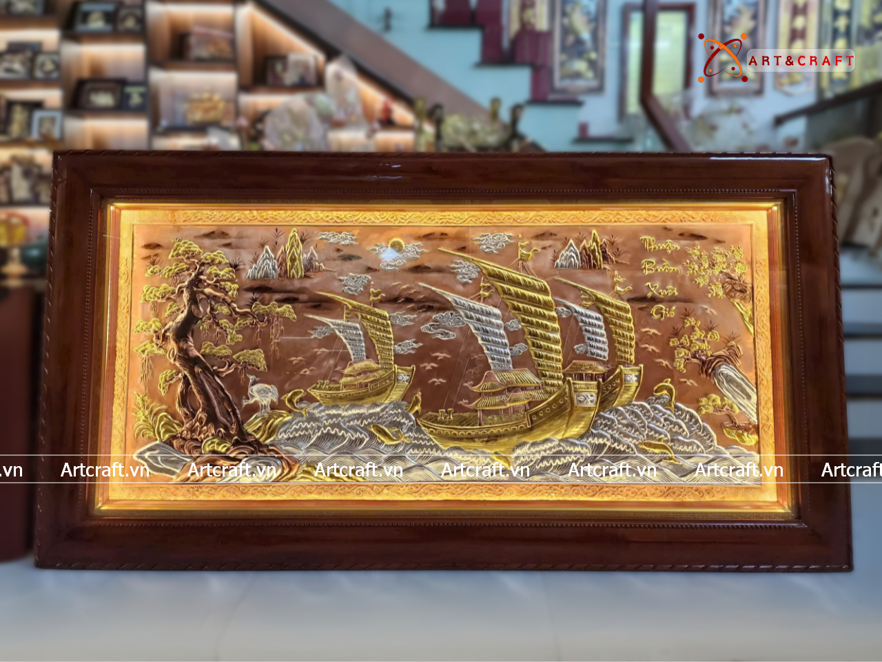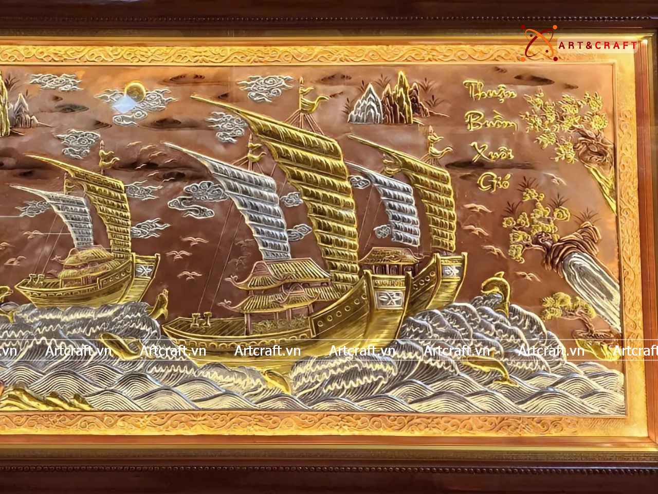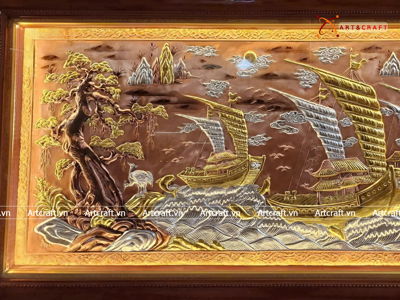 - Họa tiết tinh xảo: Tấm đồng được dát mỏng thúc chạm từng chi tiết nhỏ. Cảnh Thuyền và Biển được chế tác sống động thể hiện bức tranh thiên nhiên vừa chân thật vừa hùng vĩ.