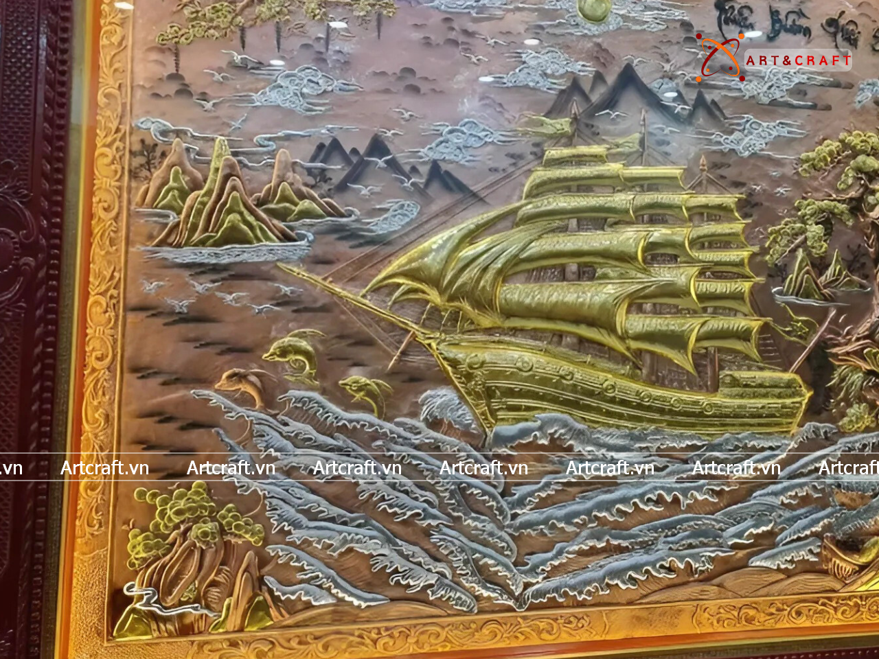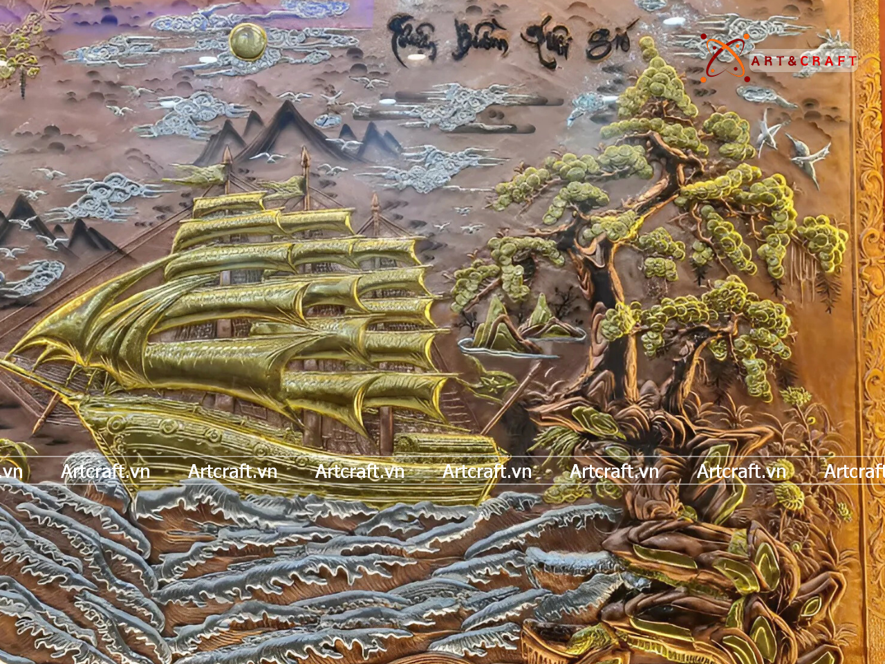 - Họa tiết tinh xảo: Tấm đồng được dát mỏng thúc chạm từng chi tiết nhỏ. Cảnh Thuyền và Biển được chế tác sống động thể hiện bức tranh thiên nhiên vừa chân thật vừa hùng vĩ.