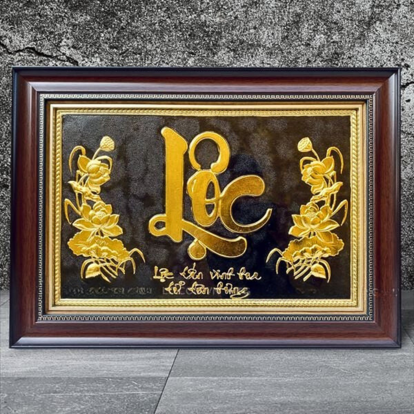 - Họa tiết tinh xảo: Tấm đồng được dát mỏng thúc chạm nổi chữ Lộc thư pháp mang tính nghệ thuật sống động.