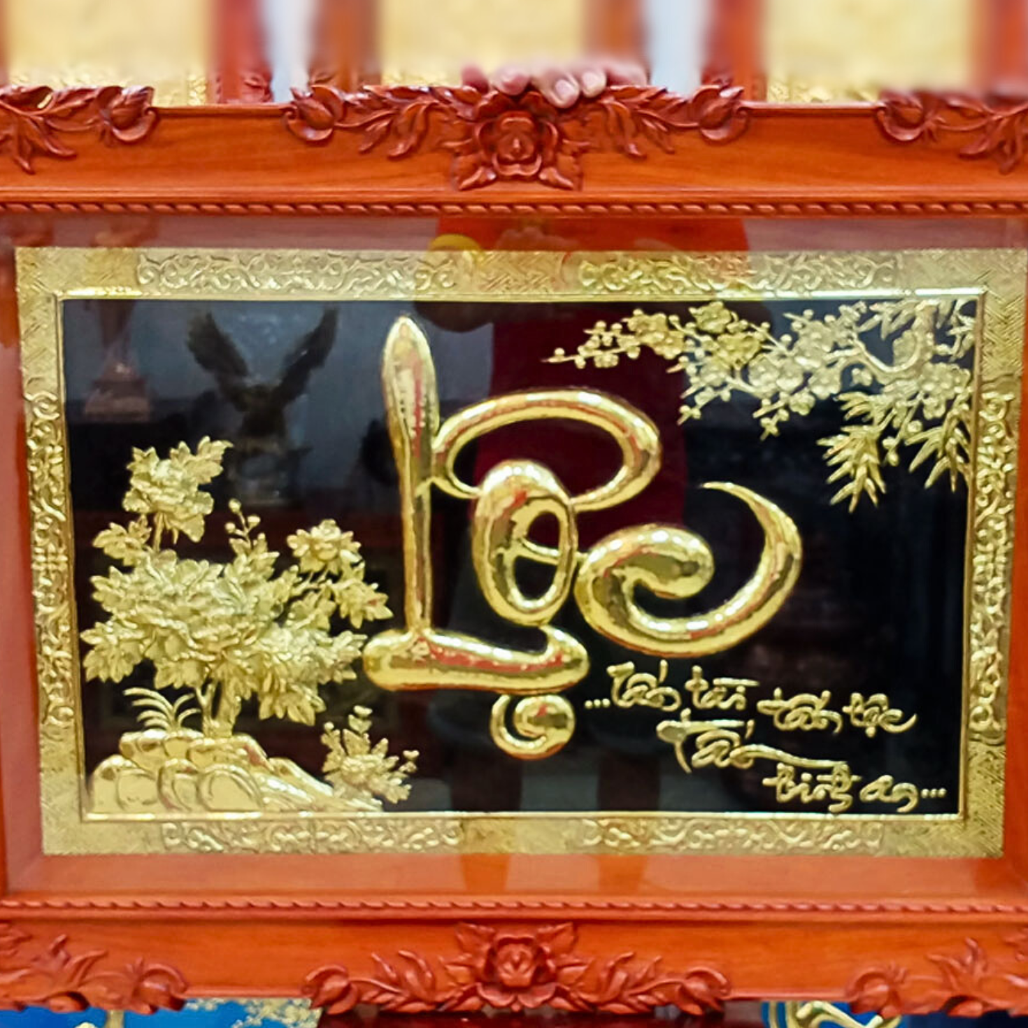 - Họa tiết tinh xảo: Tấm đồng được dát mỏng thúc chạm nổi chữ Lộc thư pháp mang tính nghệ thuật sống động.