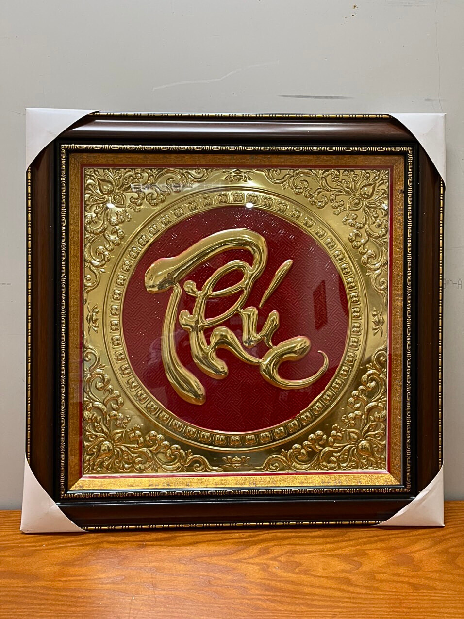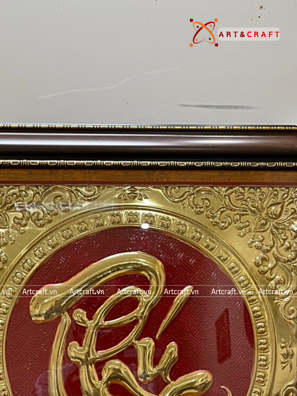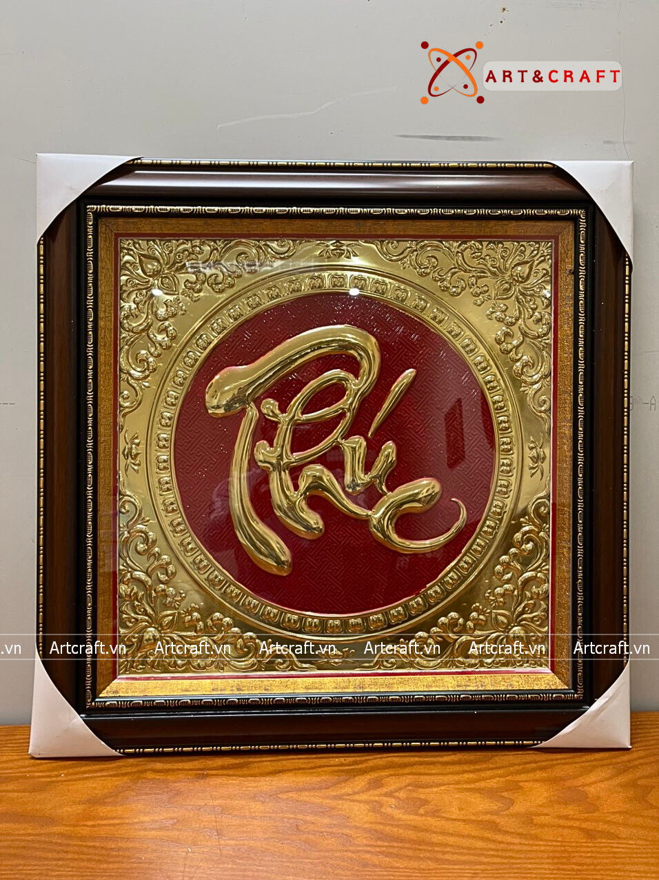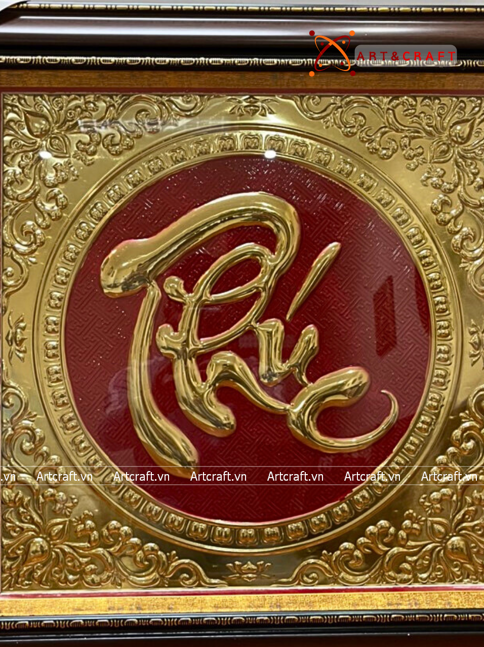 - Họa tiết tinh xảo: Tấm đồng được dát mỏng thúc chạm nổi chữ Phúc thư pháp mang tính nghệ thuật sống động.