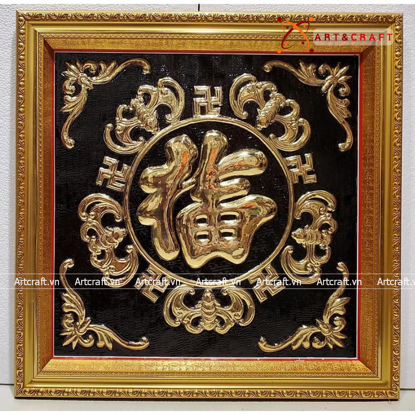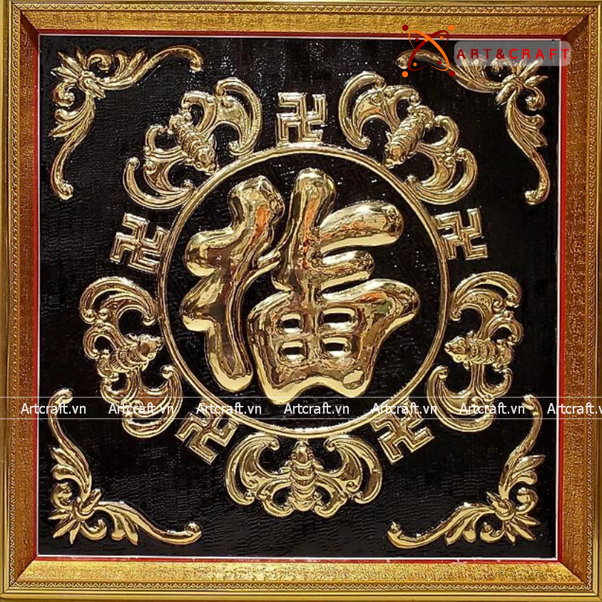 - Họa tiết tinh xảo: Tấm đồng được dát mỏng thúc chạm nổi chữ Phúc thư pháp mang tính nghệ thuật sống động.