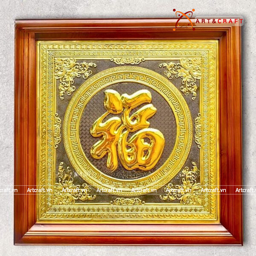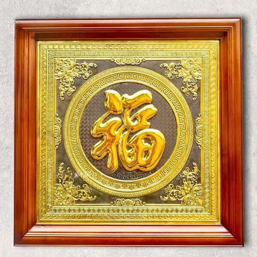 - Họa tiết tinh xảo: Tấm đồng được dát mỏng thúc chạm nổi chữ Phúc thư pháp mang tính nghệ thuật sống động.