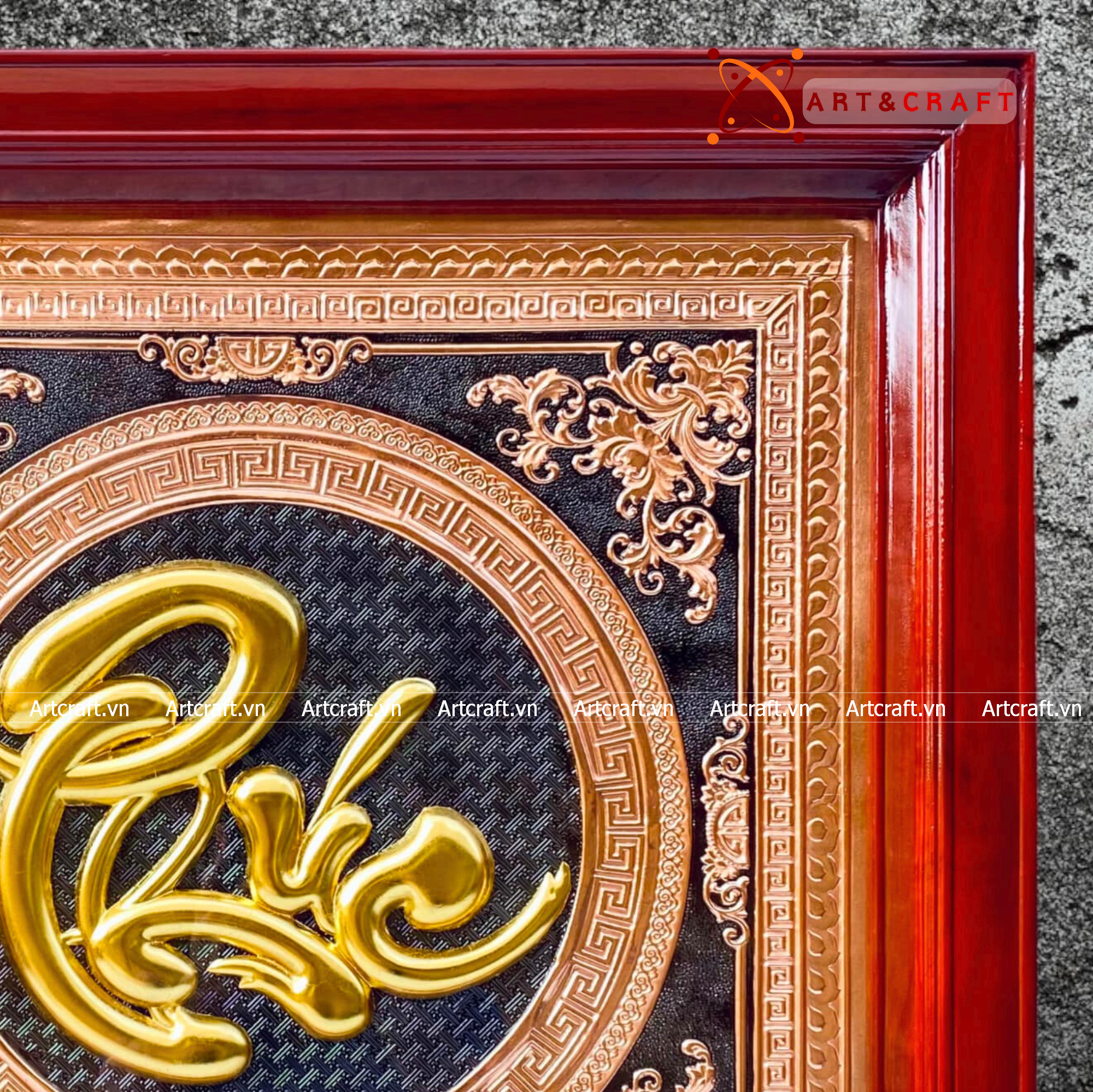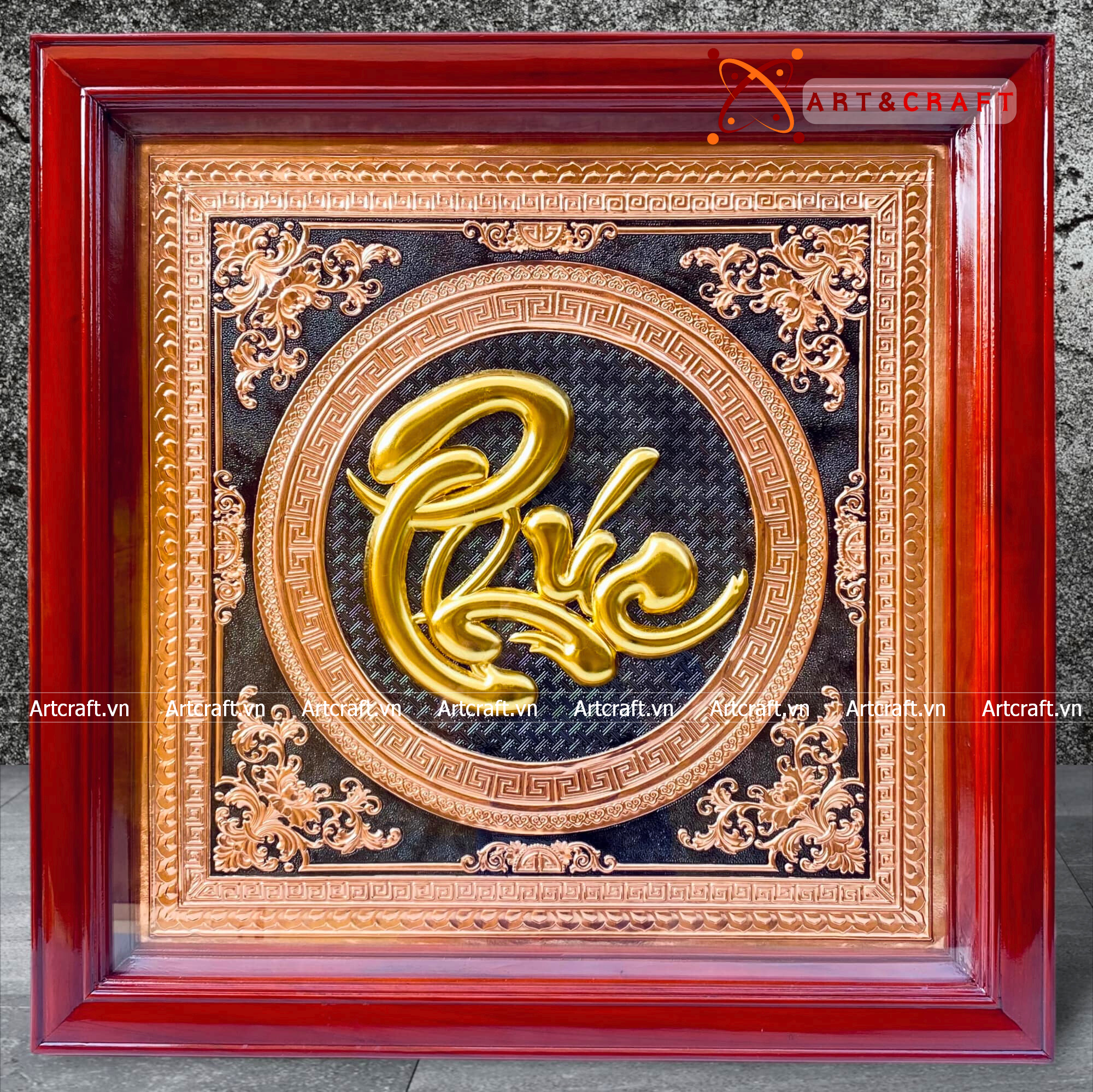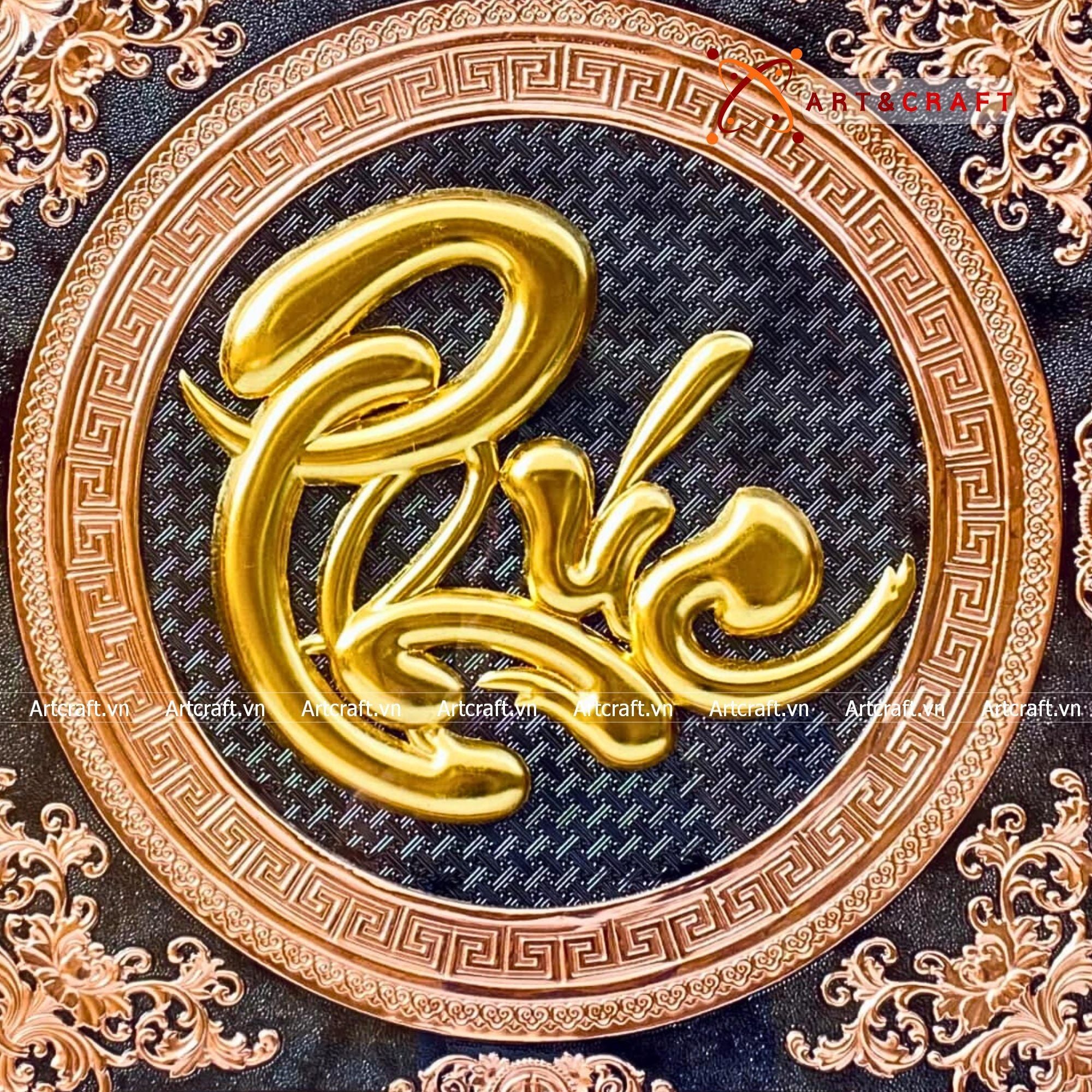 - Họa tiết tinh xảo: Tấm đồng được dát mỏng thúc chạm nổi chữ Phúc thư pháp mang tính nghệ thuật sống động.