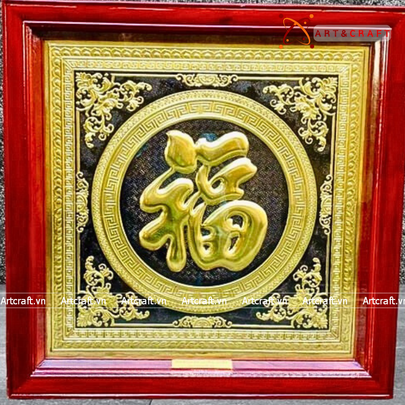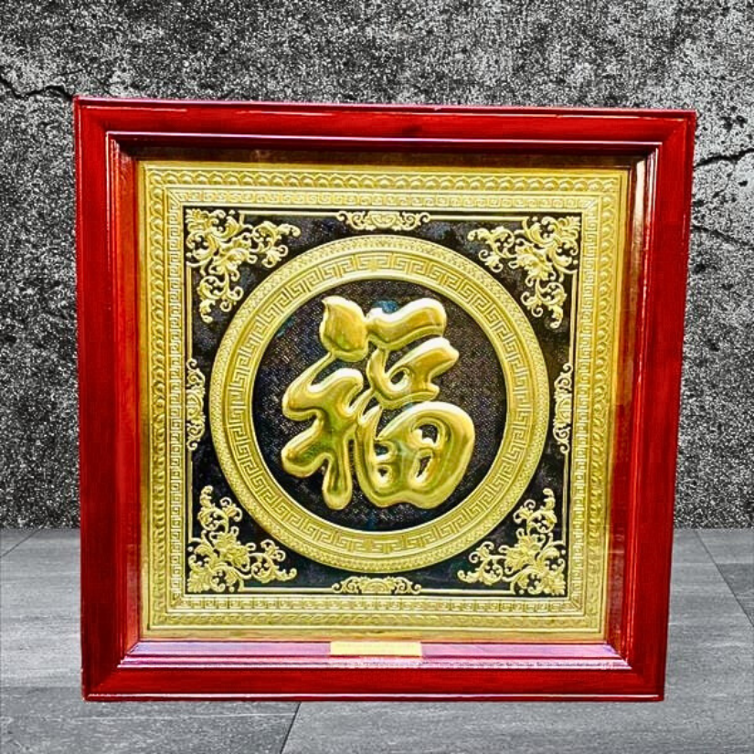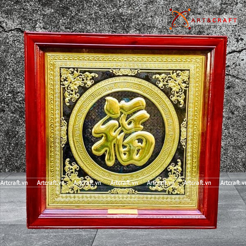 - Họa tiết tinh xảo: Tấm đồng được dát mỏng thúc chạm nổi chữ Phúc thư pháp mang tính nghệ thuật sống động.