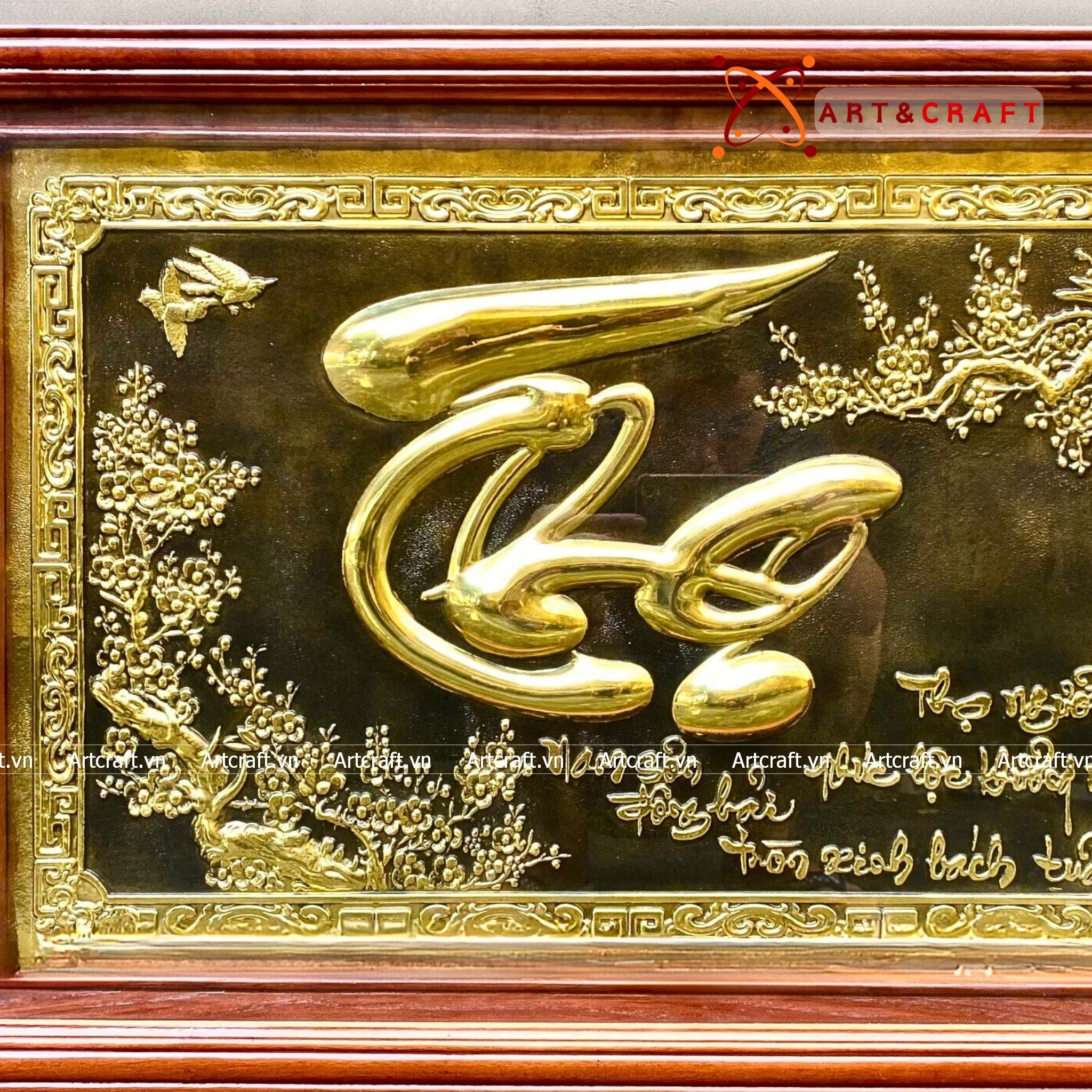 - Họa tiết tinh xảo: Tấm đồng được dát mỏng thúc chạm nổi chữ Thọ thư pháp mang tính nghệ thuật sống động.