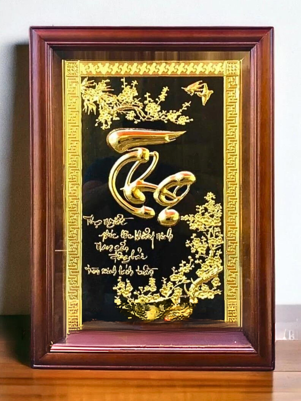 - Họa tiết tinh xảo: Tấm đồng được dát mỏng thúc chạm nổi chữ Thọ thư pháp mang tính nghệ thuật sống động.