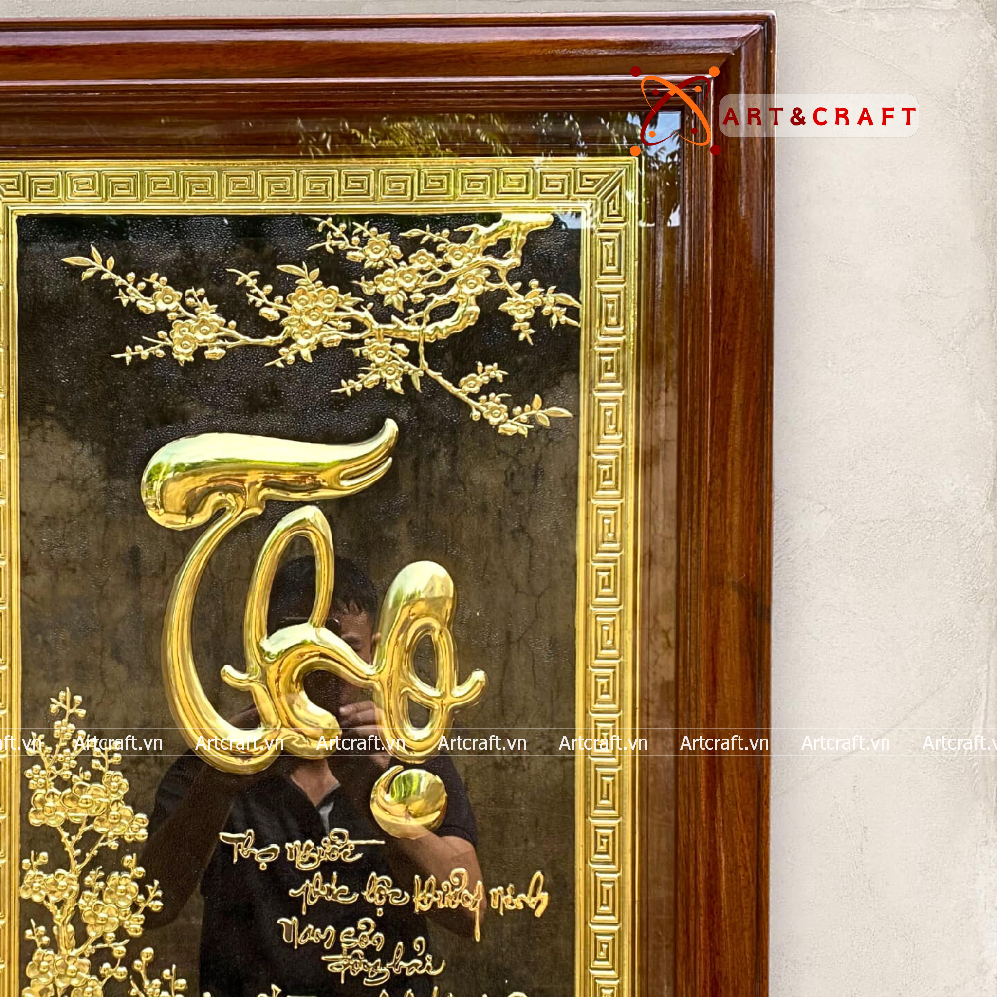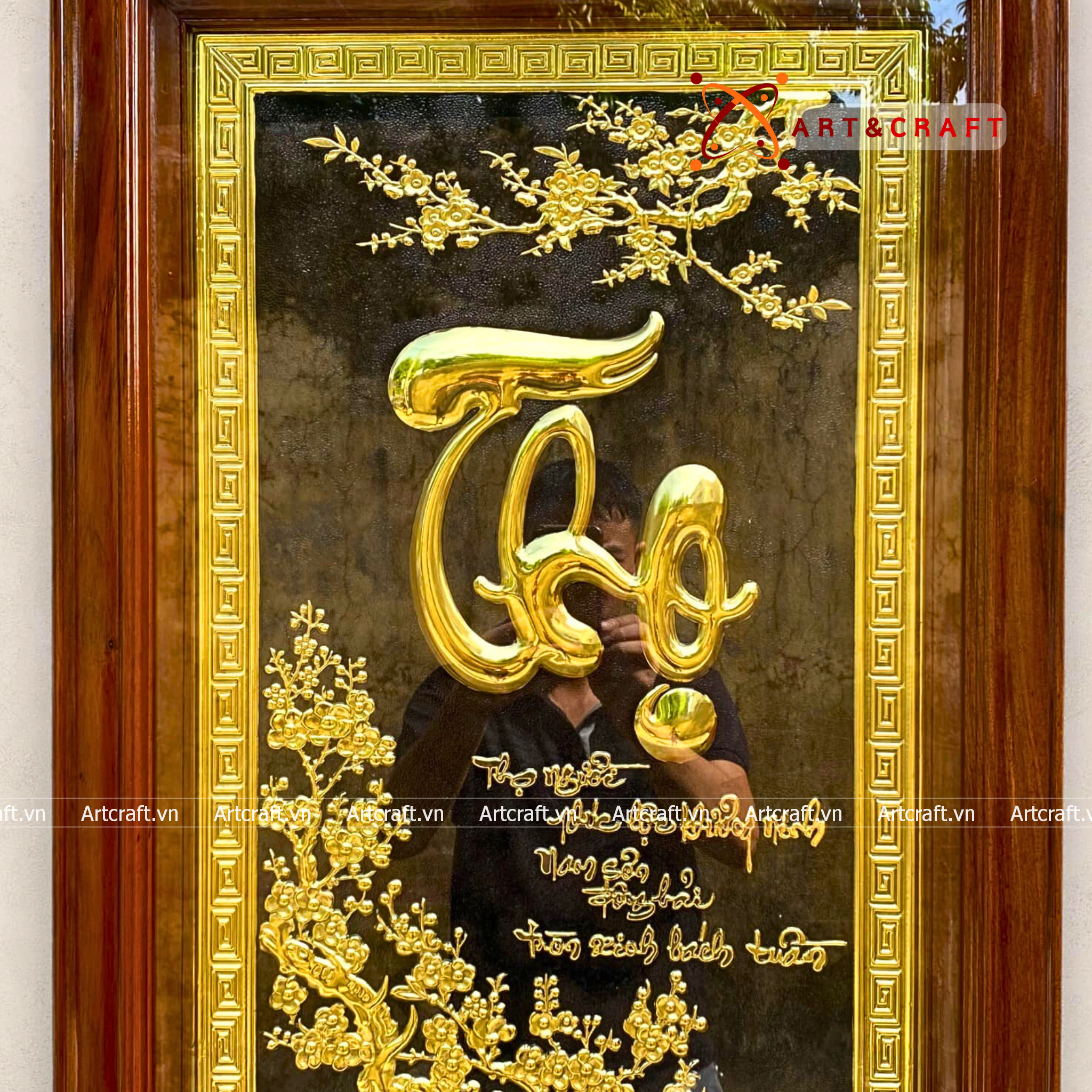 - Họa tiết tinh xảo: Tấm đồng được dát mỏng thúc chạm nổi chữ Thọ thư pháp mang tính nghệ thuật sống động.