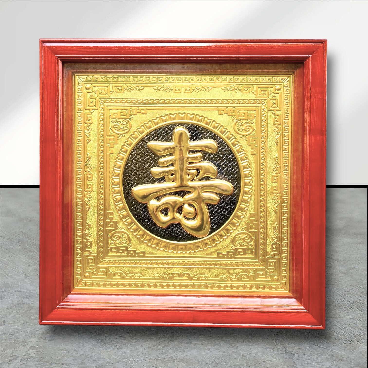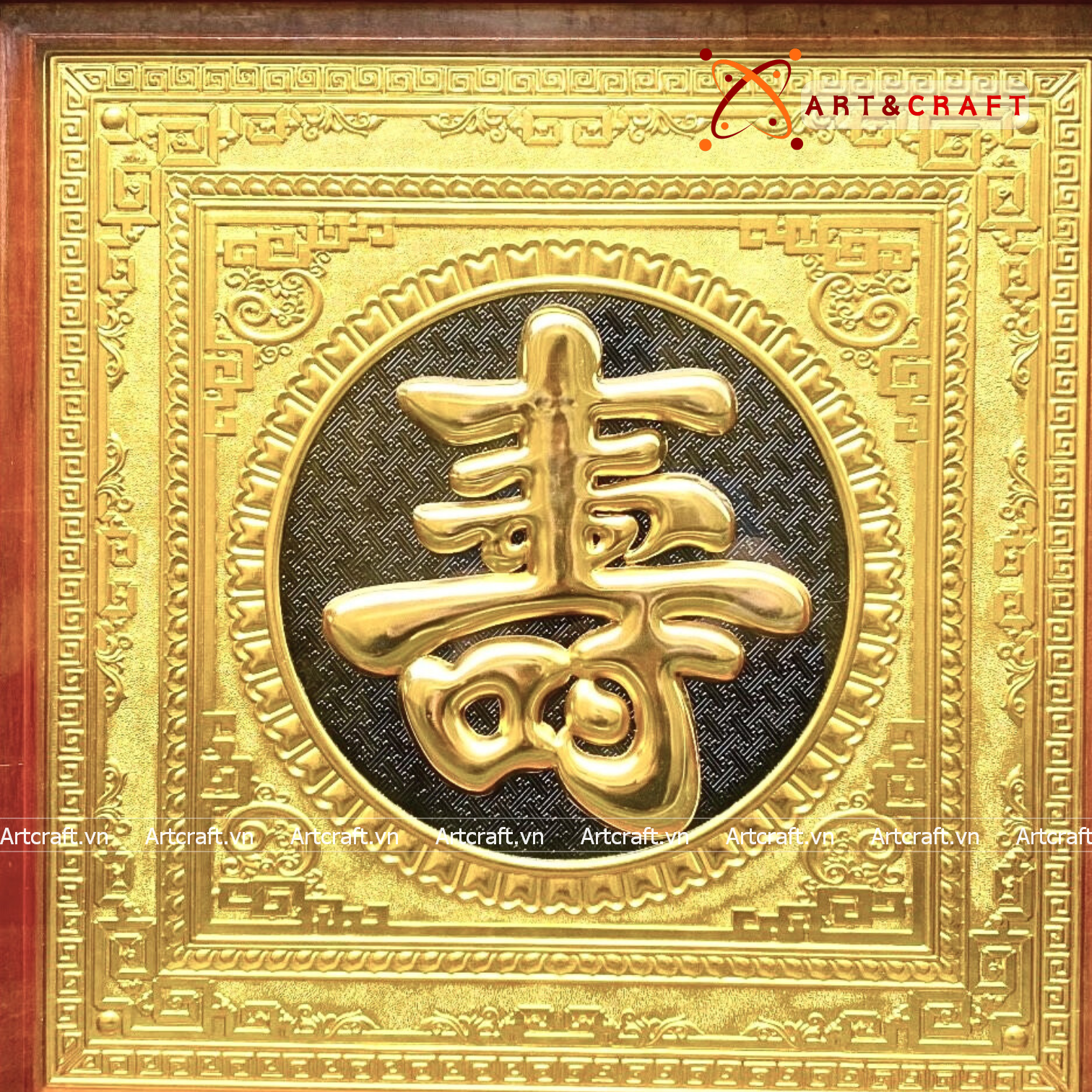 - Họa tiết tinh xảo: Tấm đồng được dát mỏng thúc chạm nổi chữ Thọ thư pháp mang tính nghệ thuật sống động.