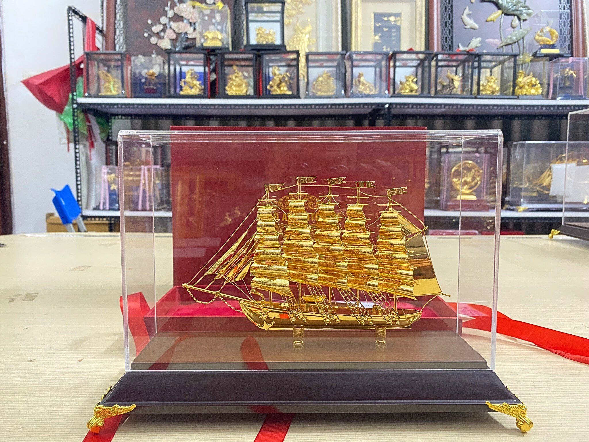 - Họa tiết tinh xảo: Quà Tặng Mô Hình Thuyền Buồm được thúc chạm tinh xảo với hình tượng thuyền buồm căng gió vượt sóng được dát vàng vô cùng sang trọng và giá trị.