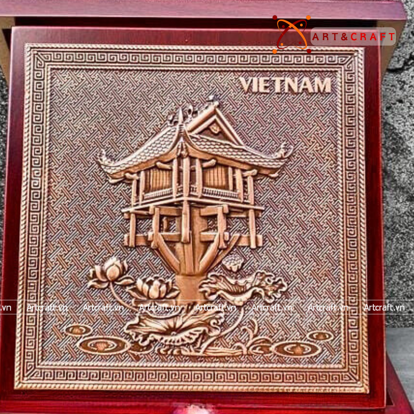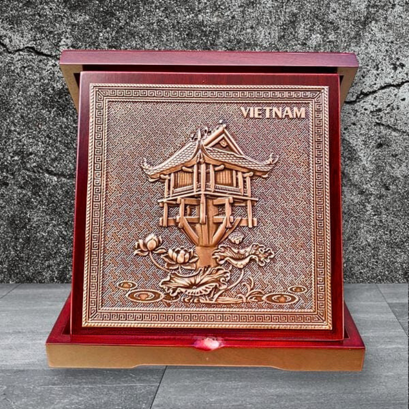 - Họa tiết tinh xảo: Tấm đồng được dát mỏng thúc chạm nổi tiêu bản chùa một cột, một trong những di sản lâu đời của dân tộc ta.