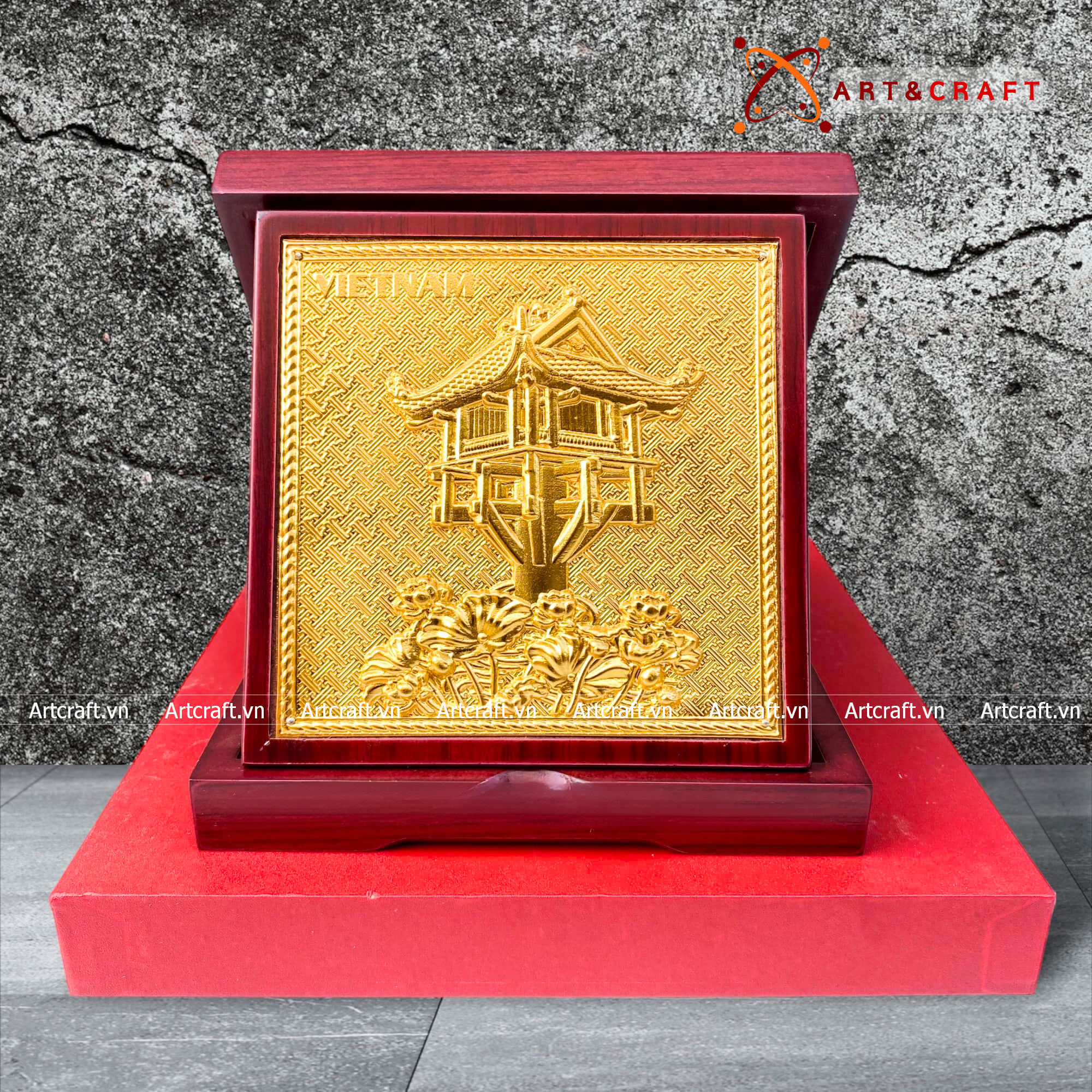 - Họa tiết tinh xảo: Tấm đồng được dát mỏng thúc chạm nổi tiêu bản chùa một cột, một trong những di sản lâu đời của dân tộc ta.