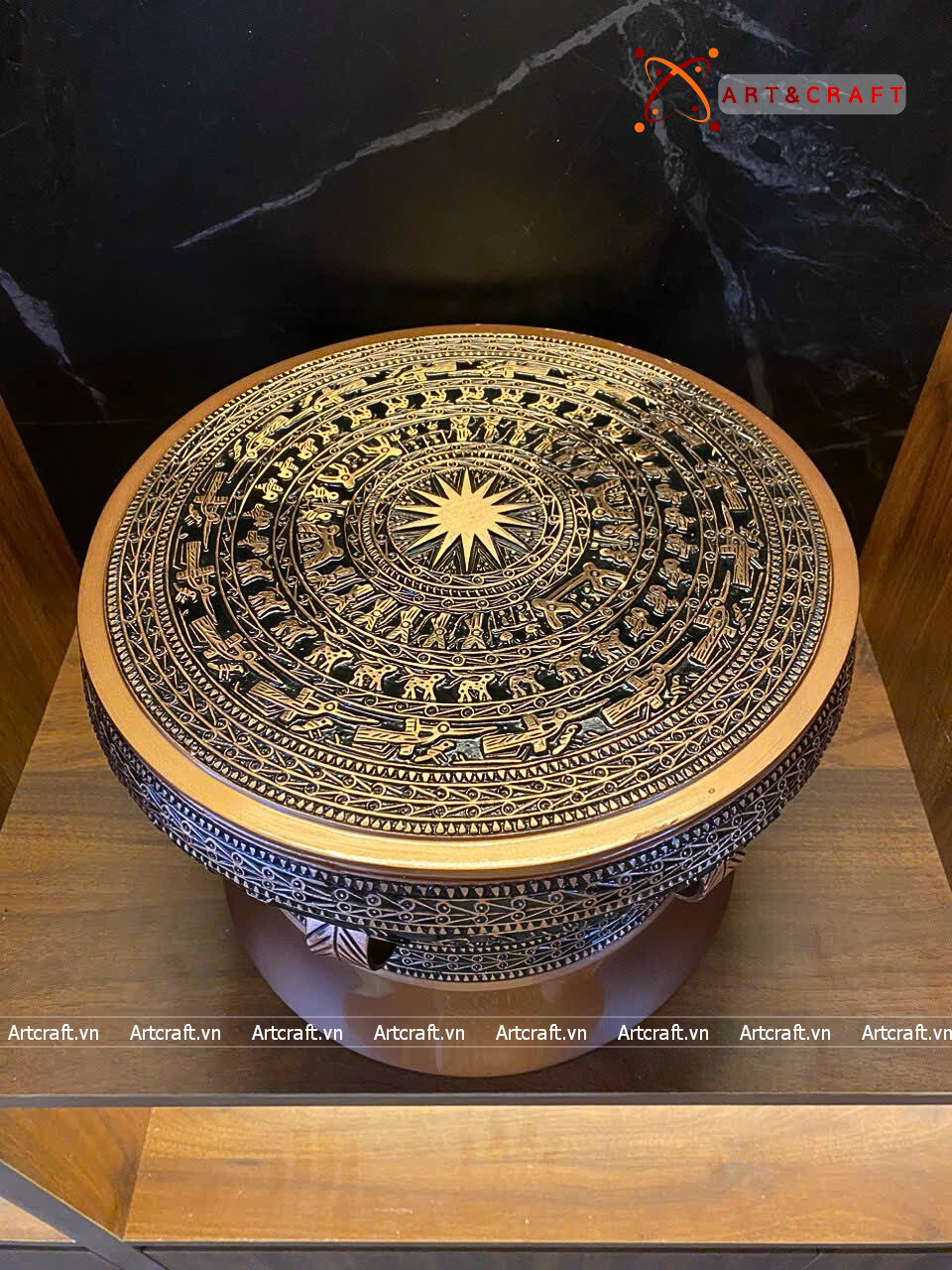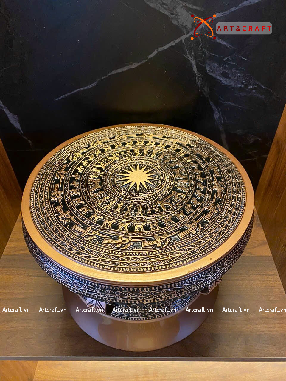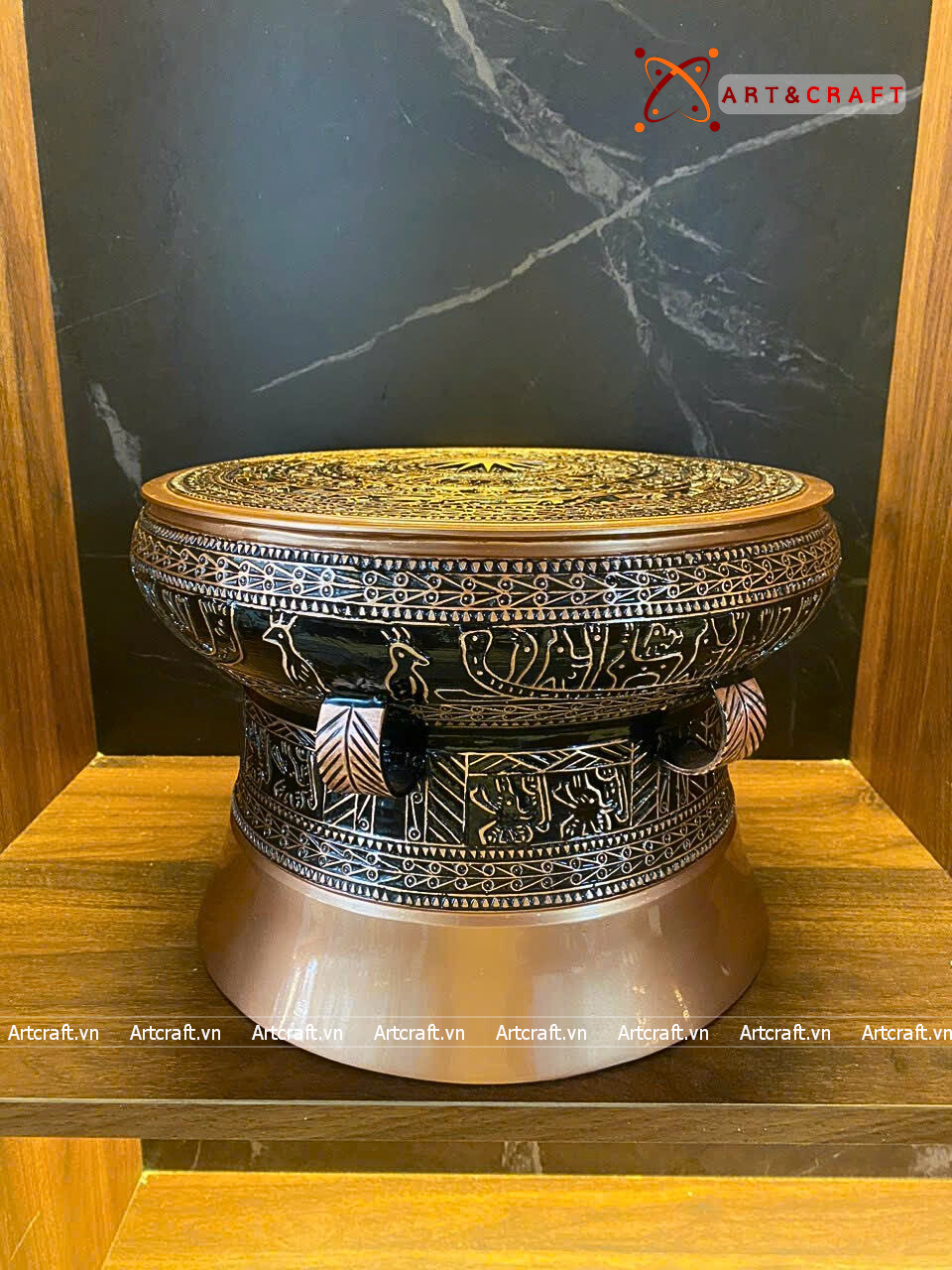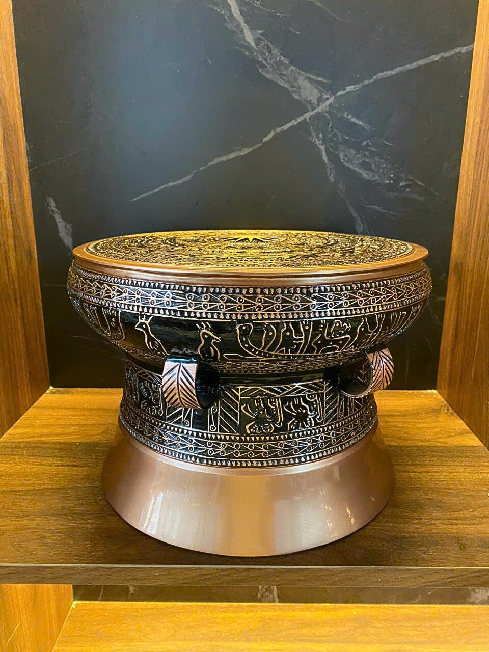 + Đặt tại kệ trưng bày tượng: Quà Tặng Trống Đồng Đông Sơn thường được đặt trên bục đặt trống hoặc đôn để làm tăng tính sang trọng cho căn phòng, cũng là tính cách, tinh thần của gia chủ người trưng bày trống.
