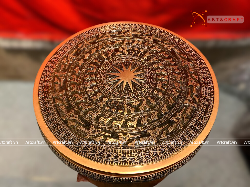 - Họa tiết tinh xảo: Quà Tặng Trống Đồng Đông Sơn được đúc chạm tinh xảo với hình tượng chim lạc, ngôi sao và các cảnh quan sinh hoạt thể hiện sống động đời sống thời kỳ văn minh Đông Sơn.
